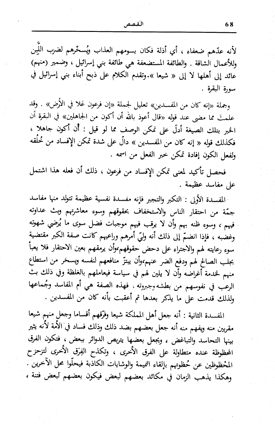 الْمَفْسَدَةُ الْأُولَى: التَّكَبُّرُ وَالتَّجَبُّرُ فَإِنَّهُ مَفْسَدَةٌ نَفْسِيَّةٌ عَظِيمَةٌ تَتَوَلَّدُ مِنْهَا مَفَاسِدُ جَمَّةٌ مِنِ احْتِقَارِ النَّاسِ وَالِاسْتِخْفَافِ بِحُقُوقِهِمْ وَسُوءِ مُعَاشَرَتِهِمْ وَبَثِّ عَدَاوَتِهِ فِيهِمْ، وَسُوءِ ظَنِّهِ بِهِمْ وَأَنْ لَا يَرْقُبَ فِيهِمْ مُوجِبَاتِ فَضْلٍ سِوَى مَا يُرْضِي شَهْوَتَهُ وَغَضَبَهُ، فَإِذَا انْضَمَّ إِلَى ذَلِكَ أَنَّهُ وَلِيُّ أَمْرِهِمْ وَرَاعِيهِمْ كَانَتْ صِفَةُ الْكِبَرِ مُقْتَضِيَةً سُوءَ رِعَايَتِهِ لَهُمْ وَالِاجْتِرَاءَ عَلَى دَحْضِ حُقُوقِهِمْ، وَأَنْ يَرْمُقَهُمْ بِعَيْنِ الِاحْتِقَارِ فَلَا يَعْبَأَ بِجَلْبِ الصَّالِحِ لَهُمْ وَدَفْعِ الضُّرِّ عَنْهُمْ، وَأَنْ يَبْتَزَّ مَنَافِعَهُمْ لِنَفْسِهِ وَيُسَخِّرَ مَنِ اسْتَطَاعَ مِنْهُمْ لِخِدْمَةِ أَغْرَاضِهِ وَأَنْ لَا يَلِينَ لَهُمْ فِي سِيَاسَةٍ فَيُعَامِلَهُمْ بِالْغِلْظَةِ وَفِي ذَلِكَ بَثُّ الرُّعْبِ فِي نُفُوسِهِمْ مِنْ بَطْشِهِ وَجَبَرُوتِهِ، فَهَذِهِ الصِّفَةُ هِيَ أَمُّ الْمَفَاسِدِ وَجِمَاعُهَا وَلِذَلِكَ قُدِّمَتْ عَلَى مَا يُذْكَرُ بَعْدَهَا ثُمَّ أُعْقِبَتْ بِأَنَّهُ كانَ مِنَ الْمُفْسِدِينَ.
