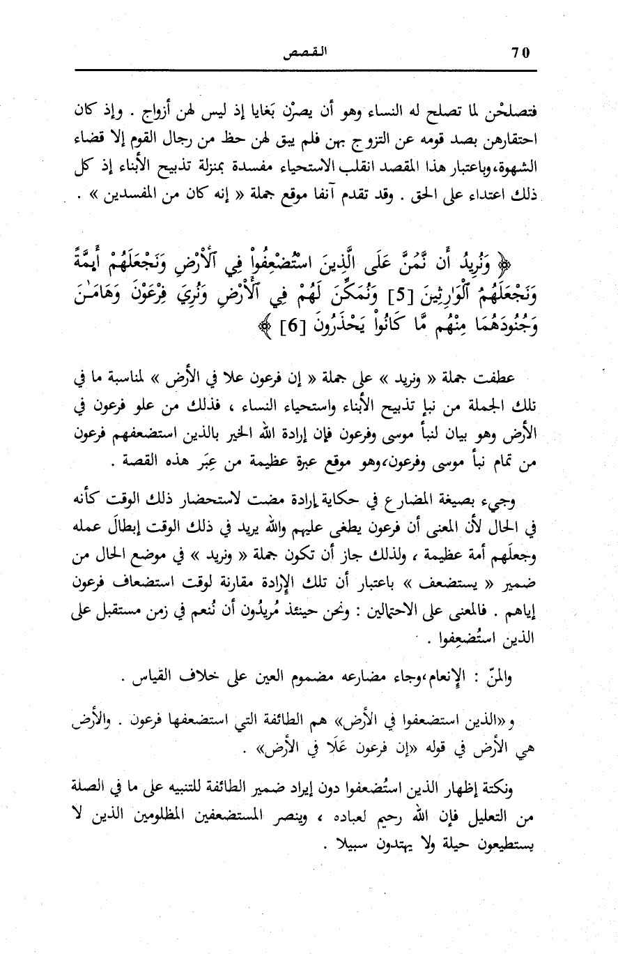 والَّذِينَ اسْتُضْعِفُوا فِي الْأَرْضِ هُمُ الطَّائِفَةُ الَّتِي اسْتَضْعَفَهَا فِرْعَوْنُ. والْأَرْضِ هِي الْأَرْضُ فِي قَوْلِهِ إِنَّ فِرْعَوْنَ عَلا فِي الْأَرْضِ [الْقَصَص: 4] .