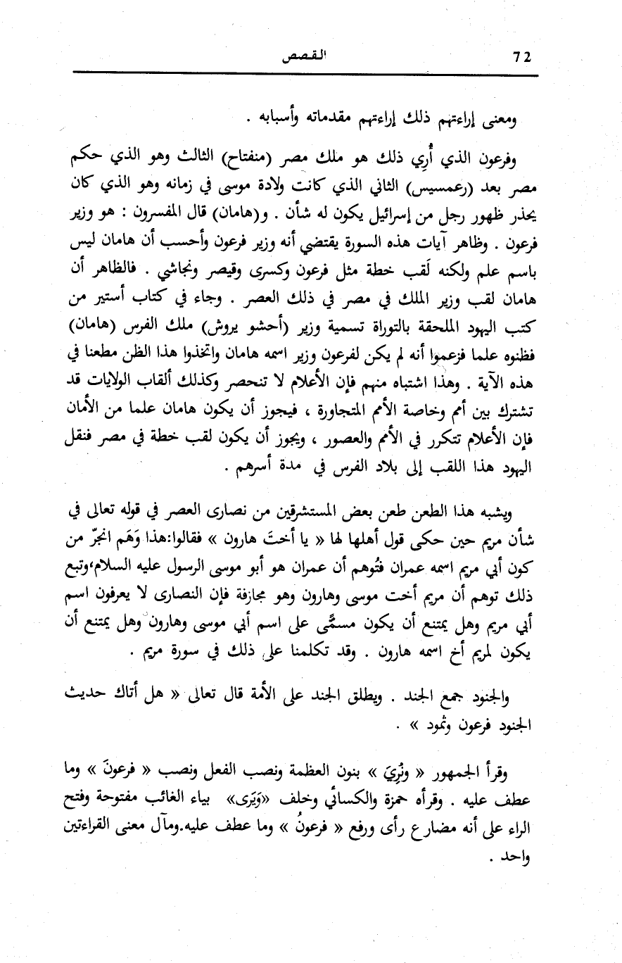 وَيُشْبِهُ هَذَا الطَّعْنَ طَعْنُ بَعْضِ الْمُسْتَشْرِقِينَ مِنْ نَصَارَى الْعَصْرِ فِي قَوْلِهِ تَعَالَى فِي شَأْنِ مَرْيَمَ حِينَ حَكَى قَوْلَ أَهْلِهَا لَهَا يَا أُخْتَ هارُونَ [مَرْيَم: 28] فَقَالُوا: هَذَا وَهَمٌ انْجَرَّ مِنْ كَوْنِ أَبِي مَرْيَمَ اسْمُهُ عِمْرَانُ فَتَوَهَّمَ أَنَّ عِمْرَانَ هُوَ أَبُو مُوسَى الرَّسُولِ عَلَيْهِ السَّلَامُ، وَتَبِعَ ذَلِكَ تَوَهُّمُ أَنَّ مَرْيَمَ أُخْتُ مُوسَى وَهَارُونَ وَهُوَ مُجَازَفَةٌ فَإِنَّ النَّصَارَى لَا يَعْرِفُونَ اسْمَ أَبِي مَرْيَمَ وَهَلْ يَمْتَنِعُ أَنْ يَكُونَ مُسَمًّى عَلَى اسْمِ أَبِي مُوسَى وَهَارُونَ وَهَلْ يَمْتَنِعُ أَنْ يَكُونَ لِمَرْيَمَ أَخٌ اسْمُهُ هَارُونُ. وَقَدْ تَكَلَّمْنَا عَلَى ذَلِكَ فِي سُورَةِ مَرْيَمَ.