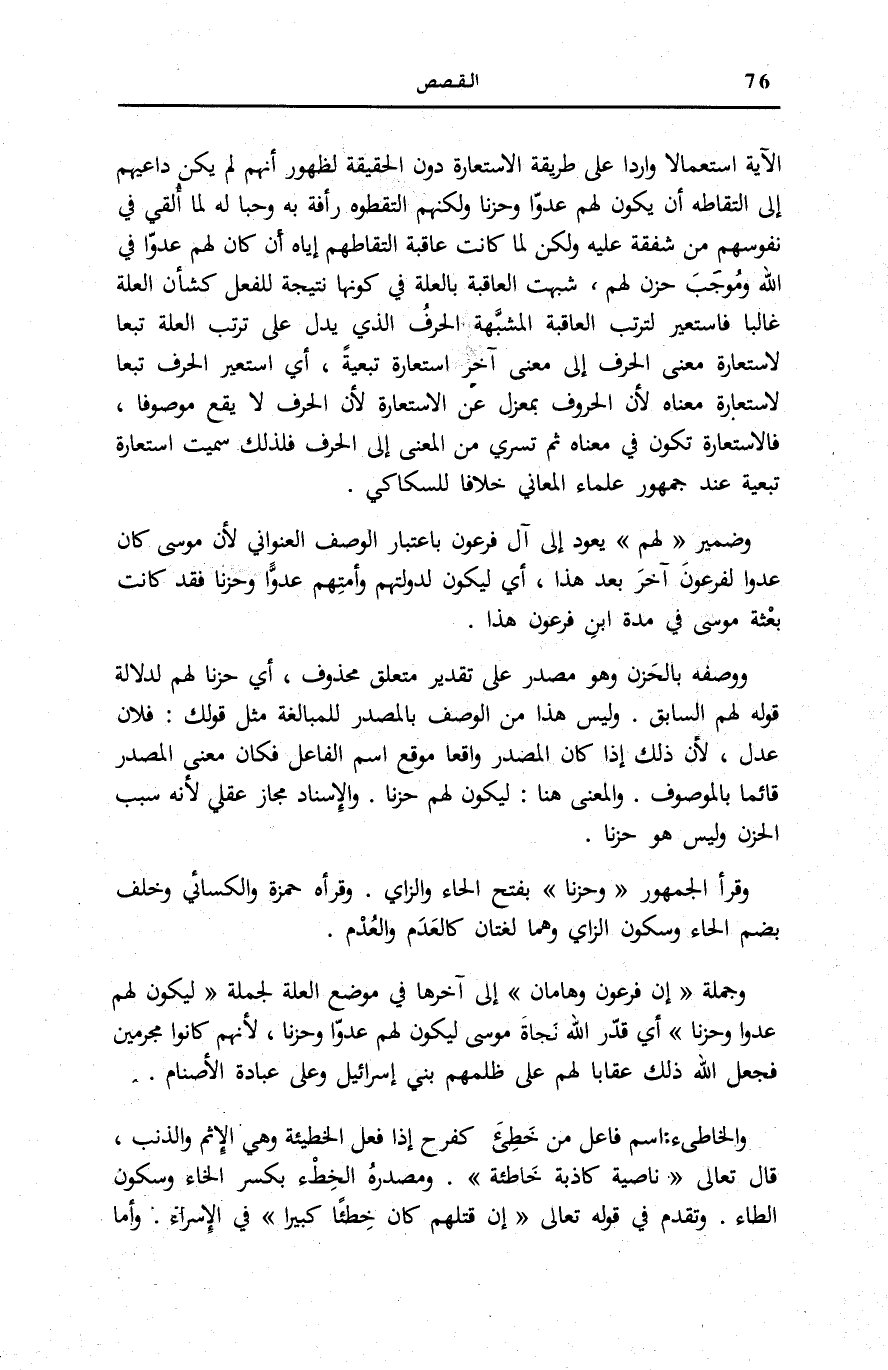 الْآيَةِ اسْتِعْمَالًا وَارِدًا عَلَى طَرِيقَةِ الِاسْتِعَارَةِ دُونَ الْحَقِيقَةِ لِظُهُورِ أَنَّهُمْ لَمْ يَكُنْ دَاعِيهِمْ إِلَى الْتِقَاطِهِ أَنْ يَكُونَ لَهُمْ عَدُوًّا وَحَزَنًا وَلَكِنَّهُمُ الْتَقَطُوهُ رَأْفَةً بِهِ وَحُبًّا لَهُ لِمَا أُلْقِيَ فِي نُفُوسِهِمْ مِنْ شَفَقَةٍ عَلَيْهِ وَلَكِنْ لَمَّا كَانَتْ عَاقِبَةُ الْتِقَاطِهِمْ إِيَّاهُ أَنْ كَانَ لَهُمْ عَدُوًّا فِي اللَّهِ وَمُوجِبَ حَزَنٍ لَهُمْ، شُبِّهَتِ الْعَاقِبَةُ بِالْعِلَّةِ فِي كَوْنِهَا نَتِيجَةً لِلْفِعْلِ كشأن الْعلَّة غَالِبا فاستعير لترتب الْعَاقِبَة المشبهة الْحَرْف الَّذِي يدل على تَرْتِيب الْعِلَّةِ تَبَعًا لِاسْتِعَارَةِ مَعْنَى الْحَرْفِ إِلَى مَعْنًى آخَرَ اسْتِعَارَةً تَبَعِيَّةً، أَيِ اسْتُعِيرَ الْحَرْفُ تَبَعًا لاستعارة مَعْنَاهُ لِأَن الْحُرُوف بمعزل عَن الِاسْتِعَارَة لِأَن الْحَرْف لَا يَقع مَوْصُوفا، فالاستعارة تكون فِي مَعْنَاهُ ثُمَّ تَسْرِي مِنَ الْمَعْنَى إِلَى الْحَرْفِ فَلِذَلِكَ سُمِّيَتِ اسْتِعَارَةً تَبَعِيَّةً عِنْدَ جُمْهُورِ عُلَمَاءِ الْمَعَانِي خِلَافًا لِلسَّكَّاكِيِّ.