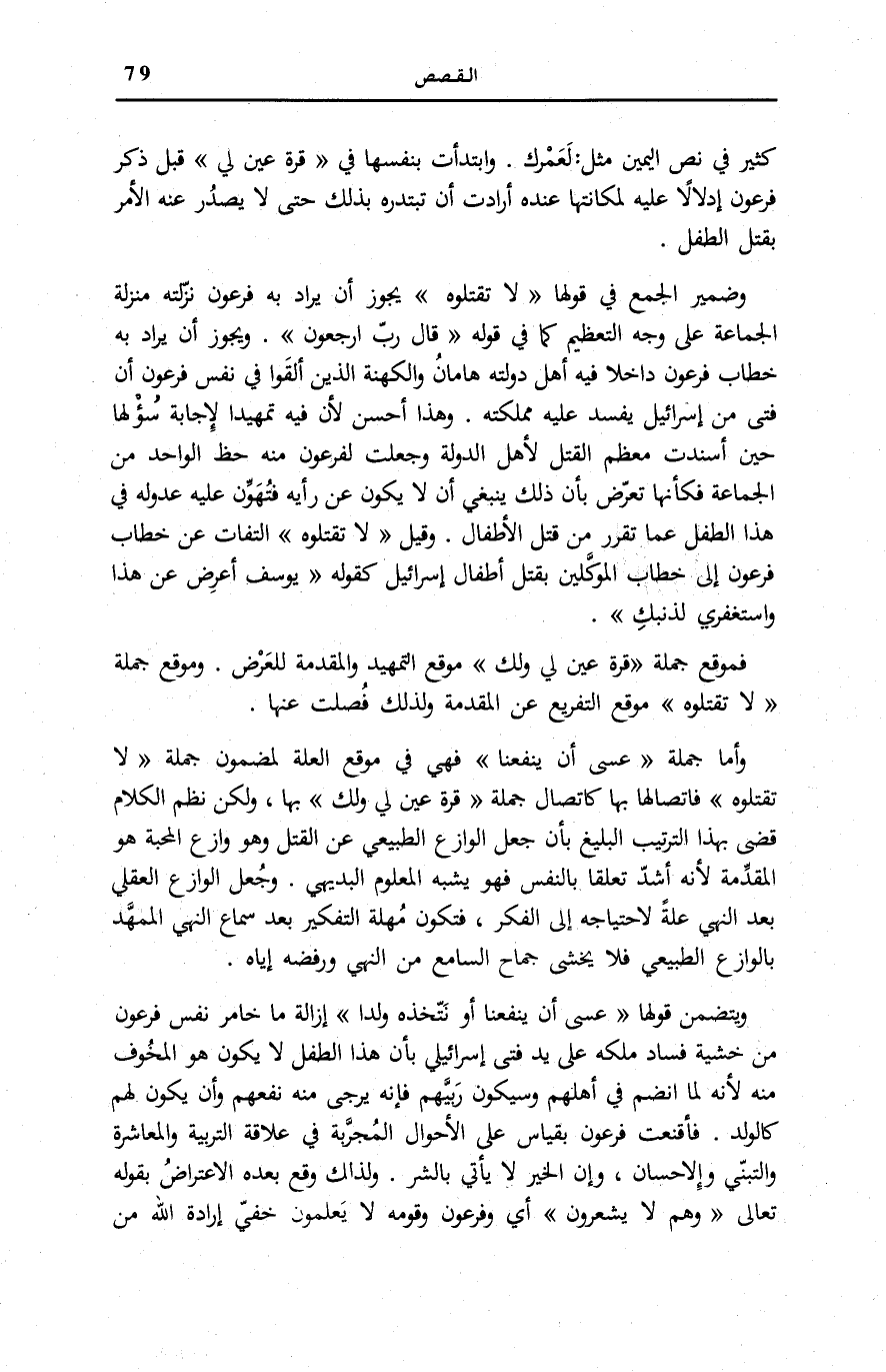 وَأَمَّا جُمْلَةُ عَسى أَنْ يَنْفَعَنا فَهِيَ فِي مَوْقِعِ الْعِلَّةِ لِمَضْمُونِ جُمْلَةِ لَا تَقْتُلُوهُ فَاتِّصَالُهَا بِهَا كاتصال جملَة قُرَّتُ عَيْنٍ لِي وَلَكَ بِهَا، وَلَكِنَّ نَظْمَ الْكَلَامِ قَضَى بِهَذَا التَّرْتِيبِ الْبَلِيغِ بِأَنْ جَعَلَ الْوَازِعَ الطَّبِيعِيَّ عَنِ الْقَتْلِ وَهُوَ وَازِعُ الْمَحَبَّةِ هُوَ الْمُقَدِّمَةَ لِأَنَّهُ أَشَدُّ تَعَلُّقًا بِالنَّفْسِ فَهُوَ يُشْبِهُ الْمَعْلُومَ الْبَدِيهِيَّ. وَجُعِلَ الْوَازِعُ الْعَقْلِيُّ بَعْدَ النَّهْيِ عِلَّةً لِاحْتِيَاجِهِ إِلَى الْفِكْرِ، فَتَكُونُ مُهْلَةُ التَّفْكِيرِ بَعْدَ سَمَاعِ النَّهْيِ الْمُمَهَّدِ بِالْوَازِعِ الطَّبِيعِيِّ فَلَا يُخْشَى جِمَاحُ السَّامِعِ مِنَ النَّهْيِ وَرَفْضُهُ إِيَّاهُ.