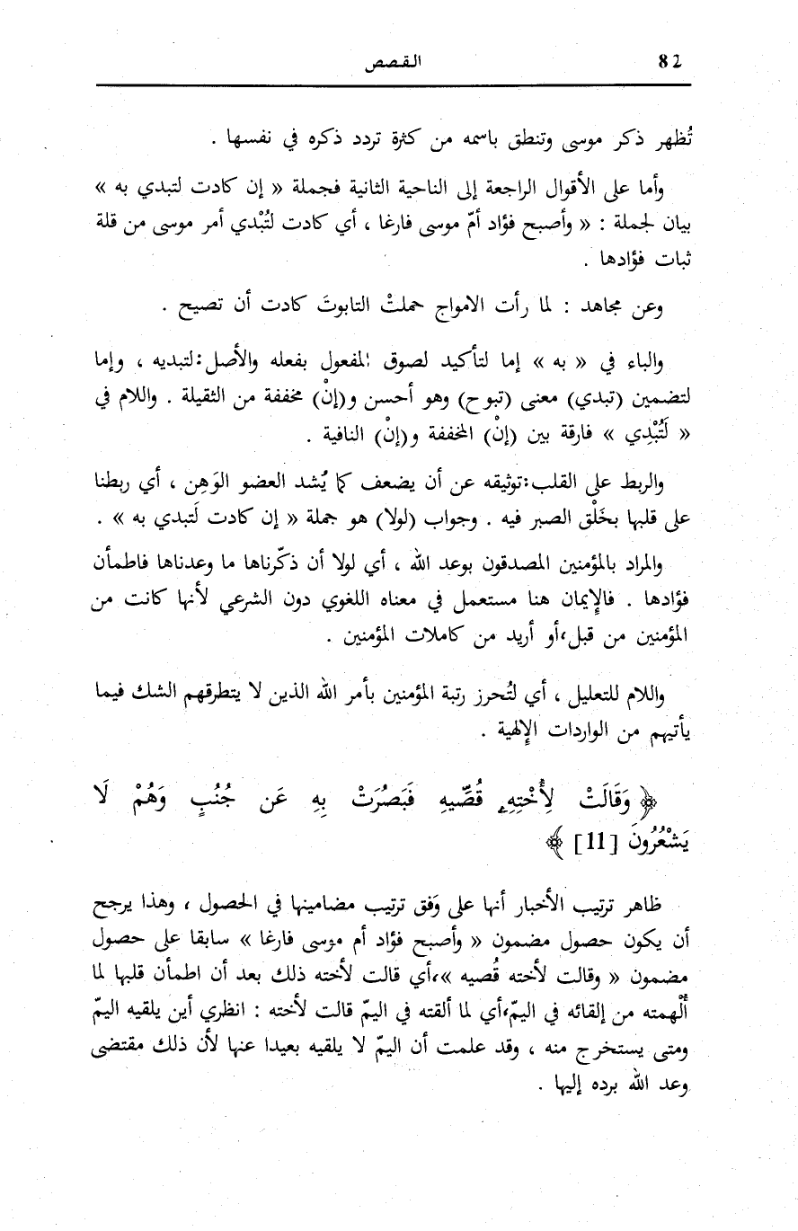 ظَاهِرُ تَرْتِيبِ الْأَخْبَارِ أَنَّهَا عَلَى وَفْقِ تَرْتِيبِ مَضَامِينِهَا فِي الْحُصُولِ، وَهَذَا يُرَجِّحُ أَنْ يَكُونَ حُصُولُ مَضْمُونِ وَأَصْبَحَ فُؤادُ أُمِّ مُوسى فارِغاً [الْقَصَص: 10] سَابِقًا عَلَى حُصُولِ مَضْمُونِ وَقالَتْ لِأُخْتِهِ قُصِّيهِ، أَيْ قَالَتْ لِأُخْتِهِ ذَلِكَ بَعْدَ أَنِ اطْمَأَنَّ قَلْبُهَا لِمَا أُلْهِمَتْهُ مِنْ إِلْقَائِهِ فِي الْيَمِّ، أَيْ لَمَّا أَلْقَتْهُ فِي الْيَمِّ قَالَتْ لِأُخْتِهِ: انْظُرِي أَيْنَ يُلْقِيهِ الْيَمُّ وَمَتَى يُسْتَخْرَجُ مِنْهُ، وَقَدْ عَلِمَتْ أَنَّ الْيَمَّ لَا يُلْقِيهِ بَعِيدًا عَنْهَا لِأَنَّ ذَلِكَ مُقْتَضَى وَعْدِ اللَّهِ بِرَدِّهِ إِلَيْهَا.