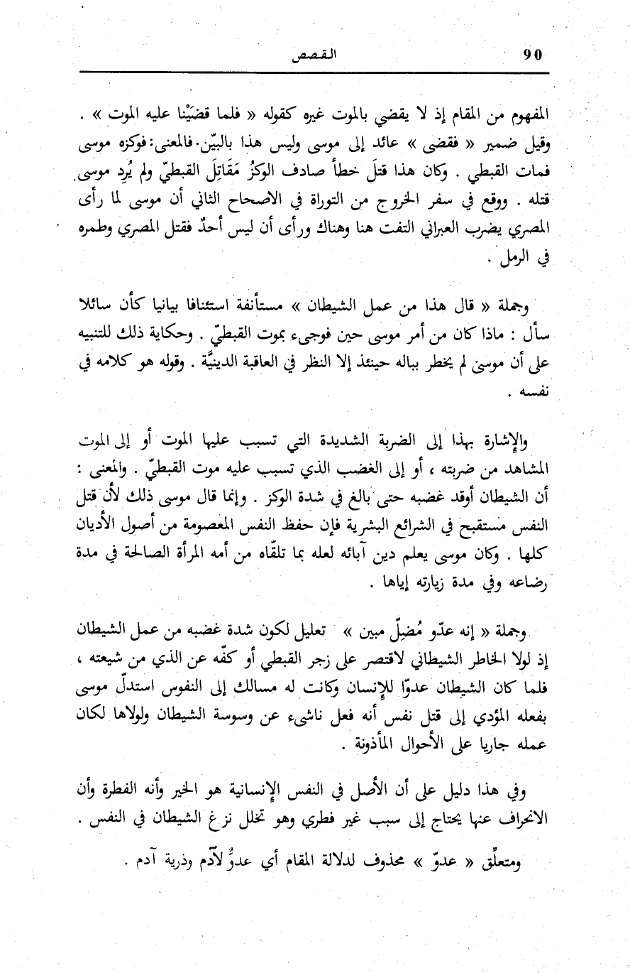 وَالْإِشَارَةُ بِهَذَا إِلَى الضَّرْبَةِ الشَّدِيدَةِ الَّتِي تَسَبَّبَ عَلَيْهَا الْمَوْتُ أَوْ إِلَى الْمَوْتِ الْمُشَاهَدِ مِنْ ضَرْبَتِهِ، أَوْ إِلَى الْغَضَبِ الَّذِي تَسَبَّبَ عَلَيْهِ مَوْتُ الْقِبْطِيِّ. وَالْمَعْنَى: أَن الشَّيْطَان أَو قد غَضَبَهُ حَتَّى بَالَغَ فِي شِدَّةِ الْوَكْزِ. وَإِنَّمَا قَالَ مُوسَى ذَلِكَ لِأَنَّ قَتْلَ النَّفْسِ مُسْتَقْبَحٌ فِي الشَّرَائِعِ الْبَشَرِيَّةِ فَإِنَّ حِفْظَ النَّفْسِ الْمَعْصُومَةِ مِنْ أُصُولِ الْأَدْيَانِ كُلِّهَا. وَكَانَ مُوسَى يَعْلَمُ دِينَ آبَائِهِ لَعَلَّهُ بِمَا تَلَقَّاهُ مِنْ أُمِّهِ الْمَرْأَةِ الصَّالِحَةِ فِي مُدَّةِ رَضَاعِهِ وَفِي مُدَّةِ زِيَارَتِهِ إِيَّاهَا.
