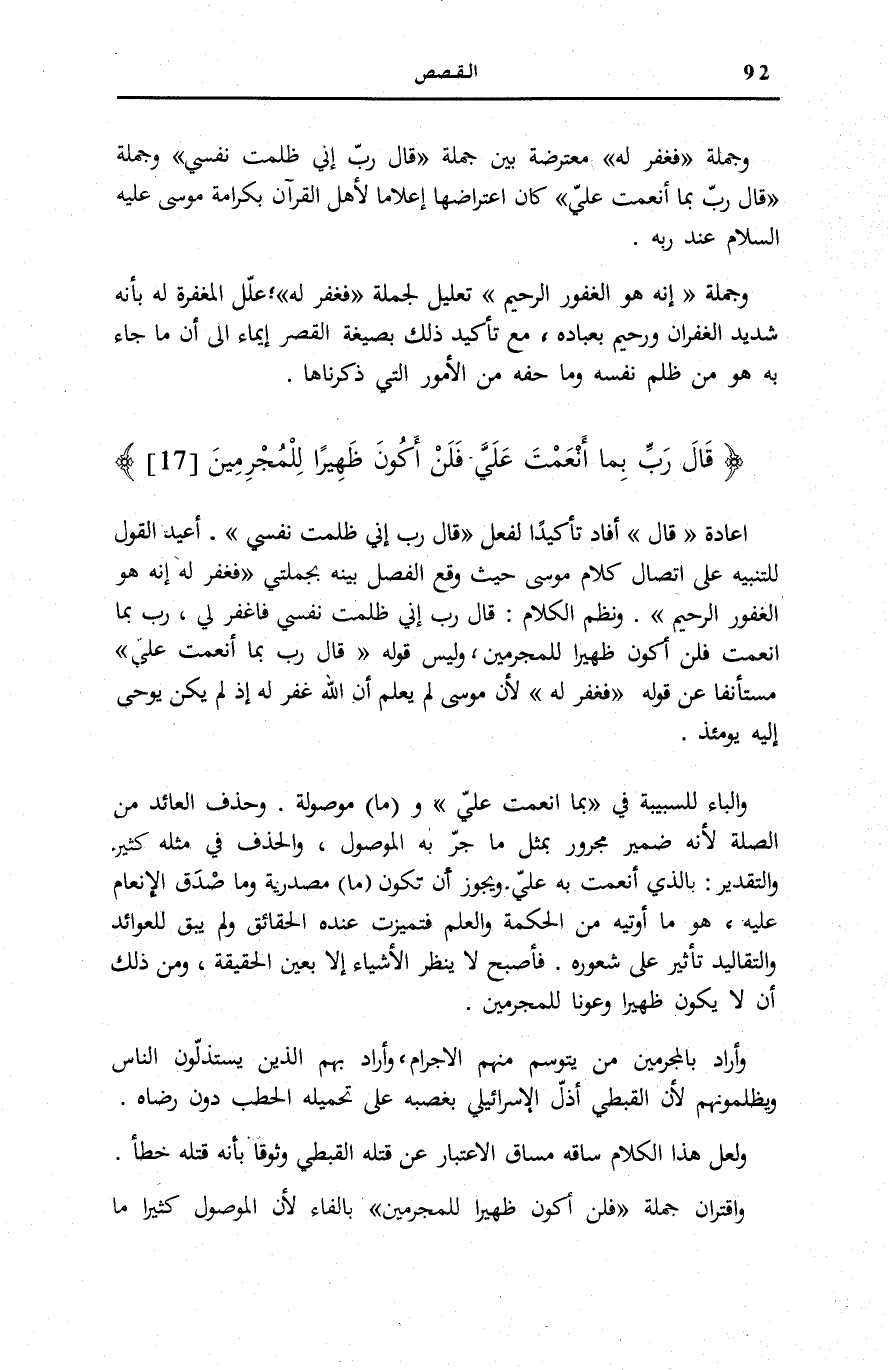 إِعَادَةُ قالَ أَفَادَ تَأْكِيدًا لَفِعْلِ قالَ رَبِّ إِنِّي ظَلَمْتُ نَفْسِي [الْقَصَص: 16] . أُعِيدَ الْقَوْلُ لِلتَّنْبِيهِ عَلَى اتِّصَالِ كَلَامِ مُوسَى حَيْثُ وَقَعَ الْفَصْلُ بَيْنَهُ بِجُمْلَتَيْ فَغَفَرَ لَهُ إِنَّهُ هُوَ الْغَفُورُ الرَّحِيمُ [الْقَصَص: 16] . وَنَظْمُ الْكَلَامِ: قَالَ رَبِّ إِنِّي ظَلَمْتُ نَفْسِي فَاغْفِرْ لِي، رَبِّ بِمَا أَنْعَمْتَ فَلَنْ أَكُونَ ظَهِيرًا لِلْمُجْرِمِينَ، وَلَيْسَ قَوْلُهُ قالَ رَبِّ بِما أَنْعَمْتَ عَلَيَّ مُسْتَأْنَفًا عَنْ قَوْلِهِ فَغَفَرَ لَهُ [الْقَصَص: 16] لِأَنَّ مُوسَى لَمْ يَعْلَمْ أَنَّ اللَّهَ غَفَرَ لَهُ إِذْ لَمْ يَكُنْ يُوحَى إِلَيْهِ يَوْمَئِذٍ.