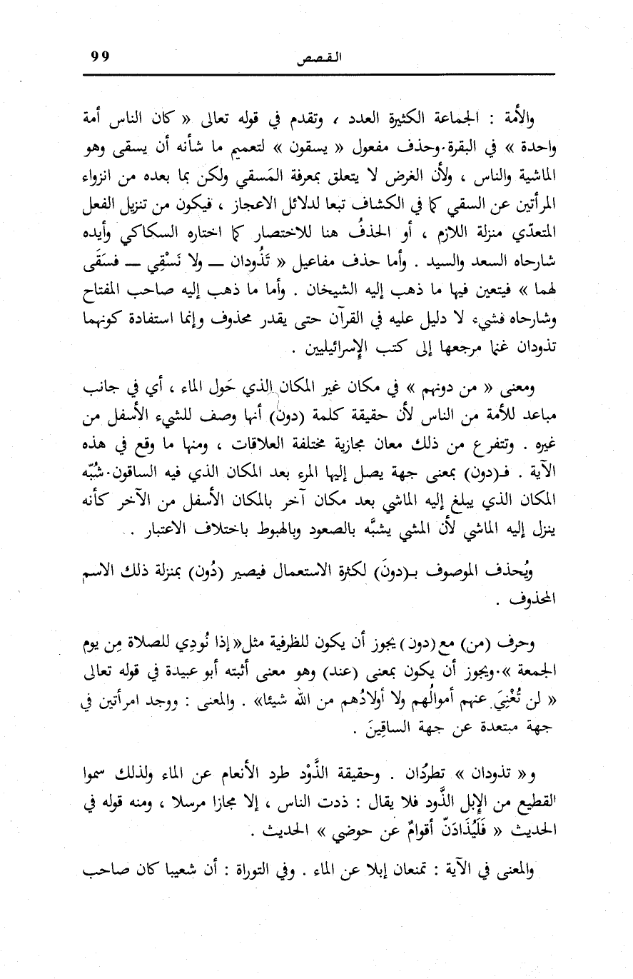 وَالْأُمَّةُ: الْجَمَاعَةُ الْكَثِيرَةُ الْعَدَدِ، وَتَقَدَّمَ فِي قَوْلِهِ تَعَالَى كانَ النَّاسُ أُمَّةً واحِدَةً فِي الْبَقَرَةِ [213] . وَحُذِفَ مَفْعُولُ يَسْقُونَ لِتَعْمِيمِ مَا شَأْنُهُ أَنْ يُسْقَى وَهُوَ الْمَاشِيَةُ وَالنَّاسُ، وَلِأَنَّ الْغَرَضَ لَا يَتَعَلَّقُ بِمَعْرِفَةِ الْمَسْقِيِّ وَلَكِنْ بِمَا بَعْدَهُ مِنِ انْزِوَاءِ الْمَرْأَتَيْنِ عَنِ السَّقْيِ كَمَا فِي «الْكَشَّافِ» تَبَعًا «لِدَلَائِلِ الْإِعْجَازِ» ، فَيَكُونُ مِنْ تَنْزِيلِ الْفِعْلِ الْمُتَعَدِّي مَنْزِلَةَ اللَّازِمِ، أَوِ الْحَذْفُ هُنَا لِلِاخْتِصَارِ كَمَا اخْتَارَهُ السَّكَّاكِيُّ وَأَيَّدَهُ شَارِحَاهُ السَّعْدُ وَالسَّيِّدُ. وَأَمَّا حَذْفُ مَفَاعِيلِ تَذُودانِ- لَا نَسْقِي- فَسَقى لَهُما فَيَتَعَيَّنُ فِيهَا مَا ذَهَبَ إِلَيْهِ الشَّيْخَانِ. وَأَمَّا مَا ذَهَبَ إِلَيْهِ صَاحِبُ «الْمِفْتَاحِ» وَشَارِحَاهُ فَشَيْءٌ لَا دَلِيلَ عَلَيْهِ فِي الْقُرْآنِ حَتَّى يُقَدَّرَ مَحْذُوفٌ وَإِنَّمَا اسْتِفَادَةُ كَوْنِهِمَا تَذُودَانِ غَنَمًا مَرْجِعُهَا إِلَى كُتُبِ الْإِسْرَائِيلِيِّينَ.