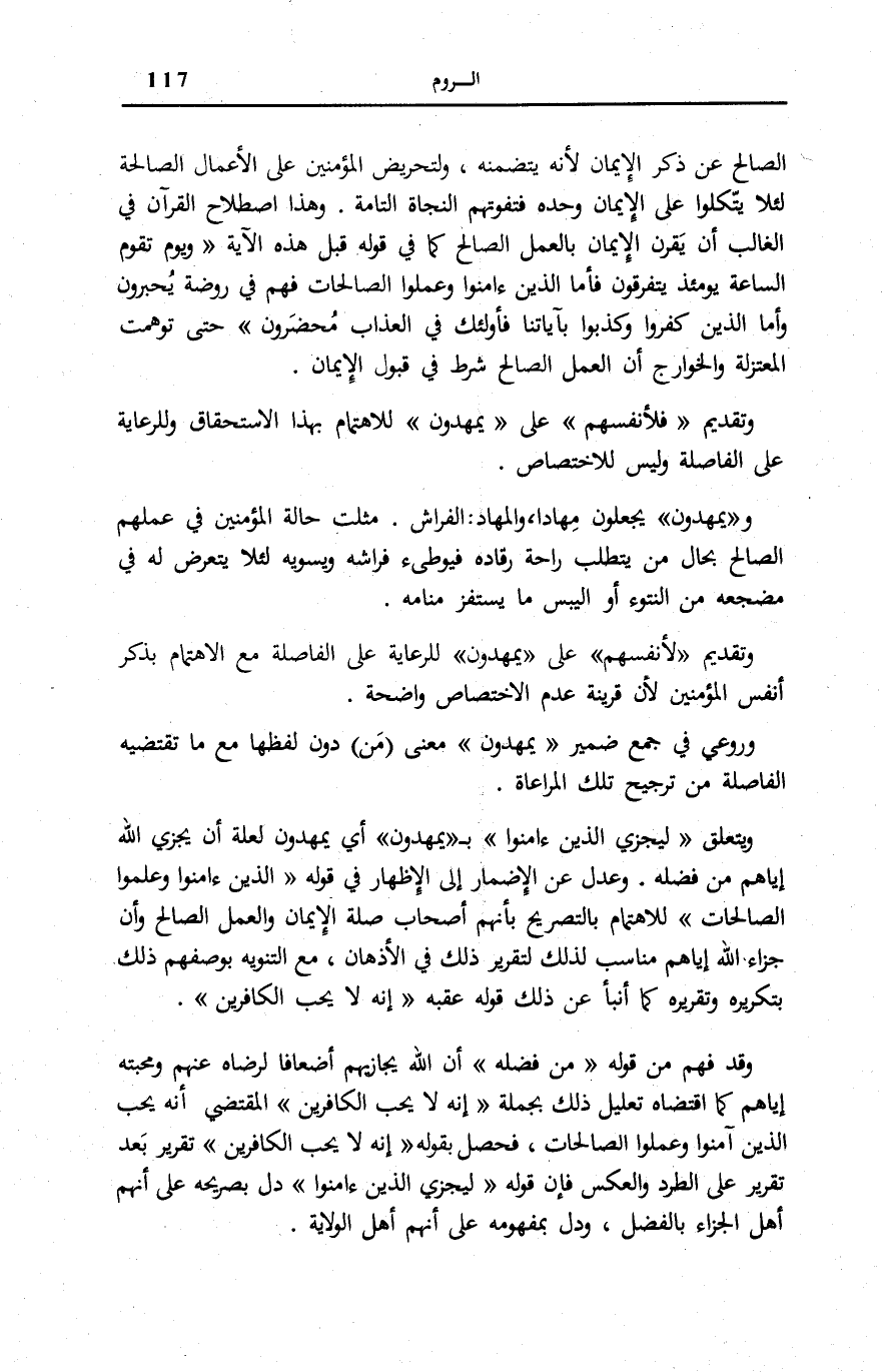 وَيَتَعَلَّقُ لِيَجْزِيَ الَّذِينَ آمَنُوا بِ يَمْهَدُونَ أَيْ يُمَهِّدُونَ لِعِلَّةٍ أَنْ يَجْزِيَ اللَّهُ إِيَّاهُمْ مِنْ فَضْلِهِ. وَعَدَلَ عَنِ الْإِضْمَارِ إِلَى الْإِظْهَارِ فِي قَوْلِهِ الَّذِينَ آمَنُوا وَعَمِلُوا الصَّالِحاتِ لِلِاهْتِمَامِ بِالتَّصْرِيحِ بِأَنَّهُمْ أَصْحَابُ صِلَةِ الْإِيمَانِ وَالْعَمَلِ الصَّالِحِ وَأَنَّ جَزَاءَ اللَّهِ إِيَّاهُمْ مُنَاسِبٌ لِذَلِكَ لِتَقْرِيرِ ذَلِكَ فِي الْأَذْهَانِ، مَعَ التَّنْوِيهِ بِوَصْفِهِمْ ذَلِكَ بِتَكْرِيرِهِ وَتَقْرِيرِهِ كَمَا أَنْبَأَ عَنْ ذَلِكَ قَوْلُهُ عَقِبَهُ إِنَّهُ لَا يُحِبُّ الْكافِرِينَ.