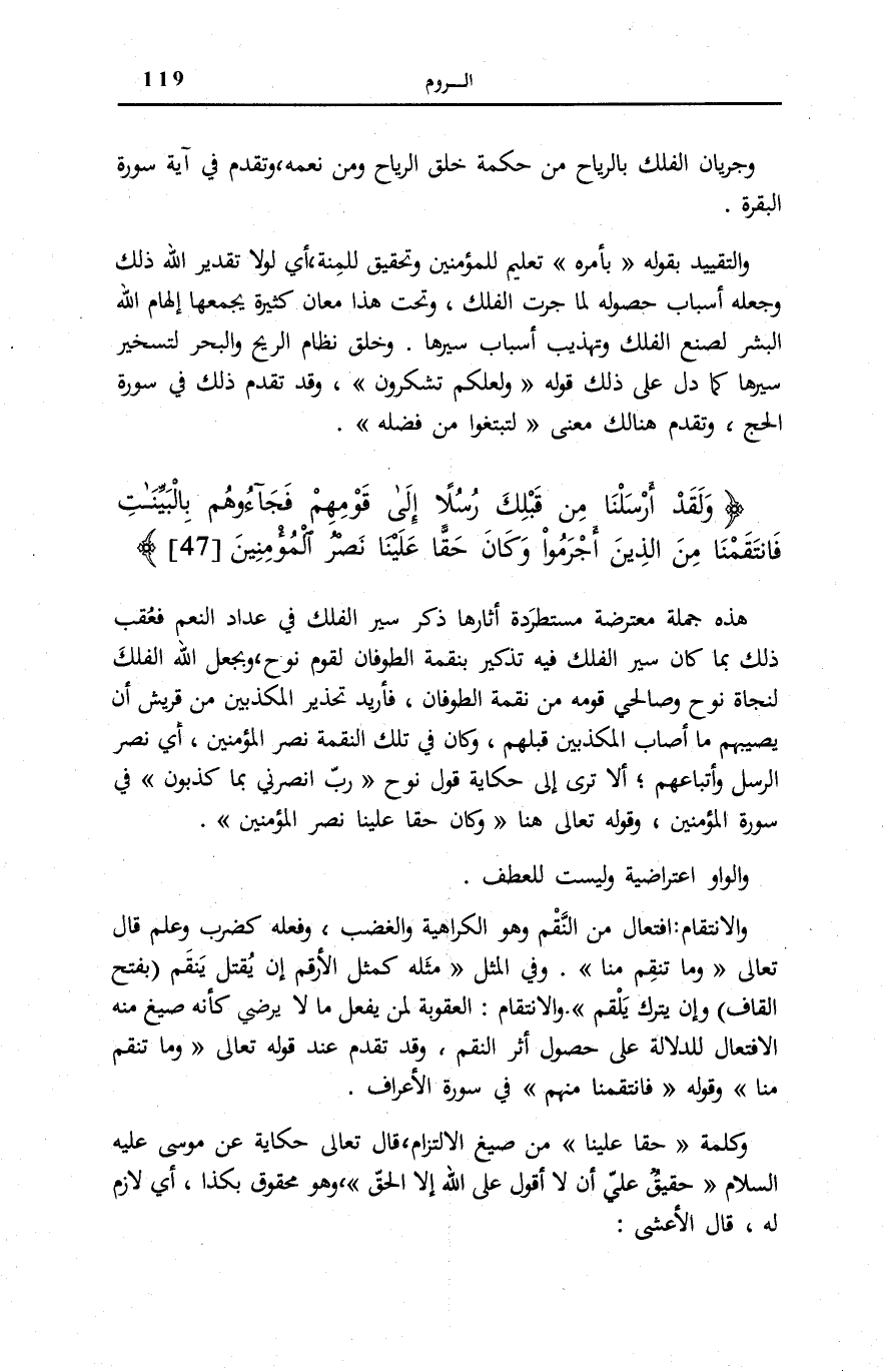 هَذِهِ جُمْلَةٌ مُعْتَرِضَةٌ مُسْتَطَرَدَةٌ آثَارُهَا ذِكْرُ سَيْرِ الْفُلْكِ فِي عِدَادِ النِّعَمِ فَعُقِبَ ذَلِكَ بِمَا كَانَ سَيْرُ الْفُلْكِ فِيهِ تَذْكِيرٌ بِنِقْمَةِ الطُّوفَانِ لِقَوْمِ نُوحٍ، وَبِجَعْلِ اللَّهِ الْفُلْكَ لِنَجَاةِ نُوحٍ وَصَالِحِي قَوْمِهِ مِنْ نِقْمَةِ الطُّوفَانِ، فَأُرِيدَ تَحْذِيرُ الْمُكَذِّبِينَ مِنْ قُرَيْشٍ أَنْ يُصِيبَهُمْ مَا أَصَابَ الْمُكَذِّبِينَ قَبْلَهُمْ، وَكَانَ فِي تِلْكَ النِّقْمَةِ نَصْرُ الْمُؤْمِنِينَ، أَيْ نَصْرُ الرُّسُلِ وَأَتْبَاعِهِمْ أَلَا تَرَى إِلَى حِكَايَةِ قَوْلِ نُوحٍ: رَبِّ انْصُرْنِي بِما كَذَّبُونِ فِي سُورَةِ الْمُؤْمِنِينَ [26] ، وَقَوْلِهِ تَعَالَى هُنَا: كانَ حَقًّا عَلَيْنا نَصْرُ الْمُؤْمِنِينَ
