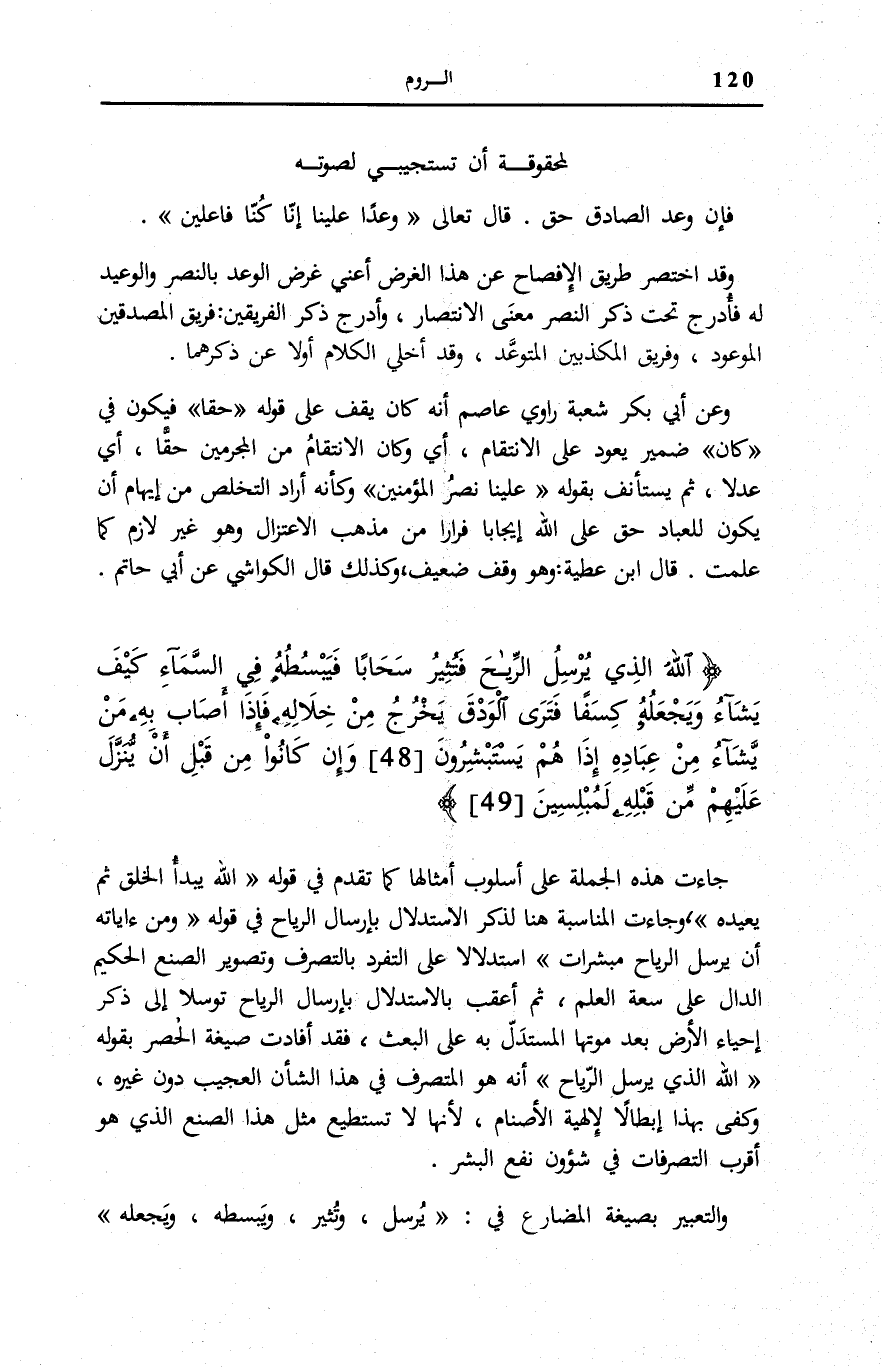 اللَّهُ الَّذِي يُرْسِلُ الرِّياحَ فَتُثِيرُ سَحاباً فَيَبْسُطُهُ فِي السَّماءِ كَيْفَ يَشاءُ وَيَجْعَلُهُ كِسَفاً فَتَرَى الْوَدْقَ يَخْرُجُ مِنْ خِلالِهِ فَإِذا أَصابَ بِهِ مَنْ يَشاءُ مِنْ عِبادِهِ إِذا هُمْ يَسْتَبْشِرُونَ (48) وَإِنْ كانُوا مِنْ قَبْلِ أَنْ يُنَزَّلَ عَلَيْهِمْ مِنْ قَبْلِهِ لَمُبْلِسِينَ (49)