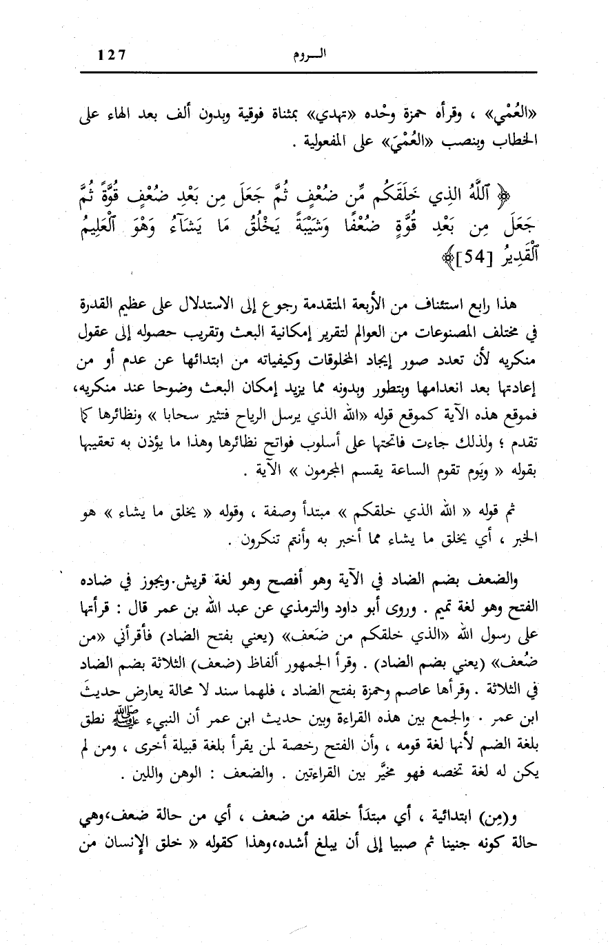 ثُمَّ قَوْلُهُ اللَّهُ الَّذِي خَلَقَكُمْ مُبْتَدَأٌ وَصِفَةٌ، وَقَوْلُهُ يَخْلُقُ مَا يَشاءُ هُوَ الْخَبَرُ، أَيْ يَخْلُقُ مَا يَشَاءُ مِمَّا أَخْبَرَ بِهِ وَأَنْتُمْ تُنْكِرُونَ. وَالضُّعْفُ بِضَمِّ الضَّادِ فِي الْآيَةِ وَهُوَ أَفْصَحُ وَهُوَ لُغَةُ قُرَيْشٍ. وَيَجُوزُ فِي ضَادِهِ الْفَتْحُ وَهُوَ لُغَةُ تَمِيمٍ. وَرَوَى أَبُو دَاوُدَ وَالتِّرْمِذِيُّ عَنْ عَبْدِ اللَّهِ ابْن عُمَرَ قَالَ: قَرَأْتُهَا عَلَى رَسُولِ اللَّهِ الَّذِي خَلَقَكُمْ مِنْ ضَعْفٍ- يَعْنِي بِفَتْح الضَّادِ- فَأَقْرَأَنِي: مِنْ ضُعْفٍ يَعْنِي بِضَمِّ الضَّادِ-. وَقَرَأَ الْجُمْهُورُ أَلْفَاظَ ضَعْفٍ الثَّلَاثَةَ- بِضَمِّ الضَّادِ- فِي الثَّلَاثَةِ. وَقَرَأَهَا عَاصِمٌ وَحَمْزَةُ بِفَتْحِ الضَّادِ، فَلَهُمَا سَنَدٌ لَا مَحَالَةَ يُعَارِضُ حَدِيثَ ابْنِ عُمَرَ. وَالْجَمْعُ بَيْنَ هَذِهِ الْقِرَاءَةِ وَبَيْنَ حَدِيثِ ابْنِ عُمَرَ أَنَّ النَّبِيءَ صَلَّى اللهُ عَلَيْهِ وَسَلَّمَ نَطَقَ بِلُغَةِ الضَّمِّ لِأَنَّهَا لُغَةُ قَوْمِهِ، وَأَنَّ الْفَتْحَ رُخْصَةٌ لِمَنْ يَقْرَأُ بِلُغَةِ قَبِيلَةٍ أُخْرَى، وَمَنْ لَمْ يَكُنْ لَهُ لُغَةٌ تَخُصُّهُ فَهُوَ مُخَيَّرٌ بَيْنَ الْقِرَاءَتَيْنِ. وَالضَّعْفُ: الْوَهْنُ وَاللِّينُ.