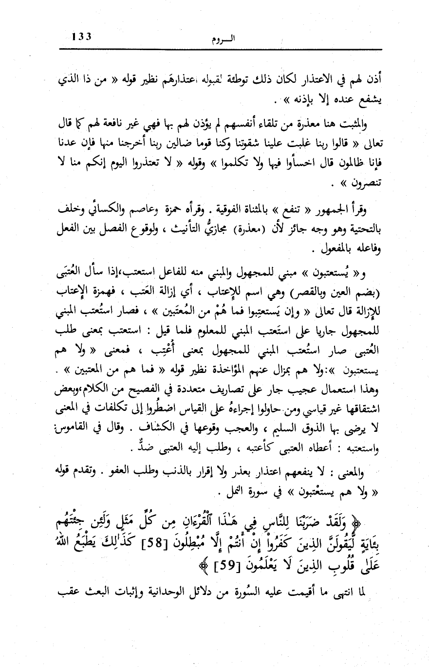 ويُسْتَعْتَبُونَ مَبْنِيٌّ لِلْمَجْهُولِ وَالْمَبْنِيُّ مِنْهُ لِلْفَاعِلِ اسْتَعْتَبَ، إِذَا سَأَلَ الْعُتْبَى- بِضَمِّ الْعَيْنِ وَبِالْقَصْرِ- وَهِيَ اسْمٌ لِلْإِعْتَابِ، أَيْ إِزَالَةُ الْعَتَبِ، فَهَمْزَةُ الْإِعْتَابِ لِلْإِزَالَةِ، قَالَ تَعَالَى: وَإِنْ يَسْتَعْتِبُوا فَما هُمْ مِنَ الْمُعْتَبِينَ [فصلت: 24] ، فَصَارَ اسْتُعْتِبَ الْمَبْنِيُّ لِلْمَجْهُولِ جَارِيًا عَلَى اسْتَعْتَبَ الْمَبْنِيِّ لِلْمَعْلُومِ فَلَمَّا قِيلَ: اسْتَعْتَبَ بِمَعْنَى طَلَبَ الْعُتْبَى صَارَ اسْتُعْتِبَ الْمَبْنِيُّ لِلْمَجْهُولِ بِمَعْنَى أُعْتِبُ، فَمَعْنَى وَلا هُمْ يُسْتَعْتَبُونَ: وَلَا هُمْ بِمُزَالٍ عَنْهُمُ الْمُؤَاخَذَةُ نَظِيرَ قَوْلِهِ فَما هُمْ مِنَ الْمُعْتَبِينَ. وَهَذَا اسْتِعْمَالٌ عَجِيبٌ جَارٍ عَلَى تَصَارِيفَ مُتَعَدِّدَةٍ فِي الْفَصِيحِ مِنَ الْكَلَامِ، وَبَعْضُ اشْتِقَاقِهَا غَيْرُ قِيَاسِيٍّ وَمَنْ حَاوَلُوا إِجْرَاءَهُ عَلَى الْقِيَاسِ اضْطُرُّوا إِلَى تَكْلِفَاتٍ فِي الْمَعْنَى لَا يَرْضَى بِهَا الذَّوْقُ السَّلِيمُ، وَالْعَجَبُ وُقُوعُهَا فِي «الْكَشَّافِ» . وَقَالَ فِي «الْقَامُوسِ» : وَاسْتَعْتَبَهُ: أَعْطَاهُ الْعُتْبَى كَأَعْتَبَهُ، وَطَلَبَ إِلَيْهِ الْعُتْبَى ضِدٌّ.