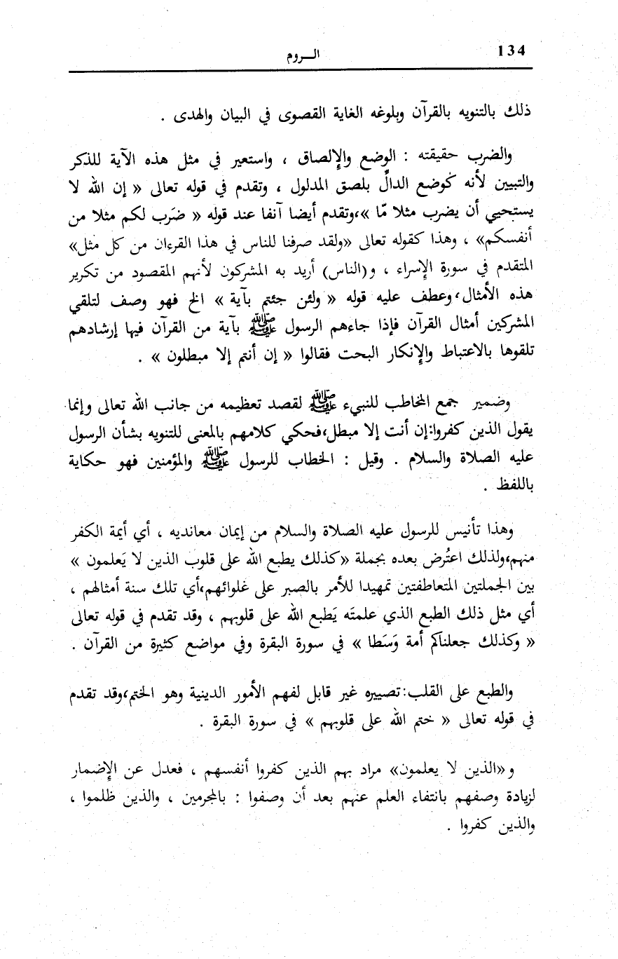 [الْبَقَرَة: 26] وَتَقَدَّمَ أَيْضًا آنِفًا عِنْدَ قَوْلِهِ ضَرَبَ لَكُمْ مَثَلًا مِنْ أَنْفُسِكُمْ [الرّوم: 28] ، وَهَذَا كَقَوْلِهِ تَعَالَى وَلَقَدْ صَرَّفْنا لِلنَّاسِ فِي هذَا الْقُرْآنِ مِنْ كُلِّ مَثَلٍ الْمُتَقَدَّمِ فِي سُورَةِ الْإِسْرَاءِ [89] ، وَ (النَّاسِ) أُرِيدَ بِهِ الْمُشْرِكُونَ لِأَنَّهُمُ الْمَقْصُودُ مِنْ تَكْرِيرِ هَذِهِ الْأَمْثَالِ، وَعَطَفَ عَلَيْهِ قَوْلَهُ وَلَئِنْ جِئْتَهُمْ بِآيَةٍ إِلَخْ فَهُوَ وَصْفٌ لِتَلَقِّي الْمُشْرِكِينَ أَمْثَالَ الْقُرْآنِ فَإِذَا جَاءَهُمُ الرَّسُولُ صَلَّى اللهُ عَلَيْهِ وَسَلَّمَ بِآيَةٍ مِنَ الْقُرْآنِ فِيهَا إِرْشَادُهُمْ تَلَقَّوْهَا بِالِاعْتِبَاطِ وَالْإِنْكَارِ الْبَحْتِ فَقَالُوا إِنْ أَنْتُمْ إِلَّا مُبْطِلُونَ.