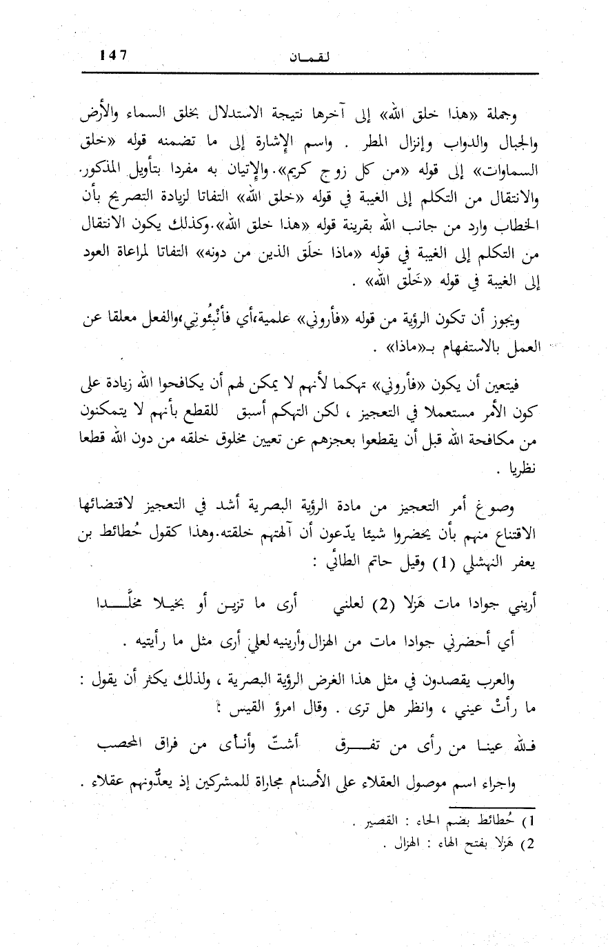 وَصَوْغُ أَمْرِ التَّعْجِيزِ مِنْ مَادَّةِ الرُّؤْيَةِ الْبَصَرِيَّةِ أَشَدُّ فِي التَّعْجِيزِ لِاقْتِضَائِهَا الِاقْتِنَاعَ مِنْهُمْ بِأَنْ يُحْضِرُوا شَيْئًا يَدَّعُونَ أَنَّ آلِهَتَهُمْ خَلَقَتْهُ. وَهَذَا كَقَوْلِ حُطَائِطِ بْنِ يَعْفُرَ النَّهْشَلِيِّ (¬1) وَقِيلِ حَاتِمٍ الطَّائِيِّ: