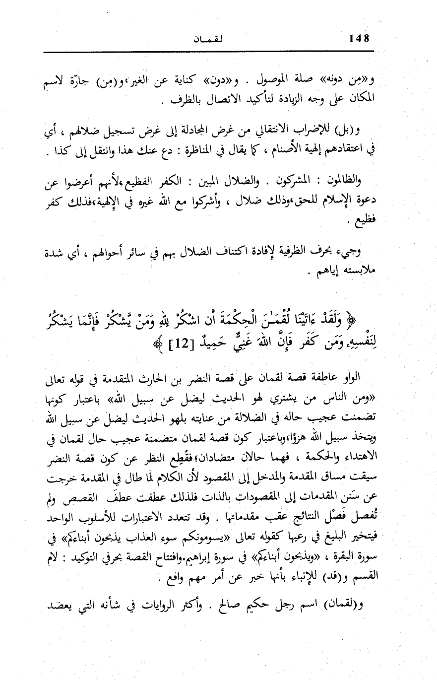 الْوَاوُ عَاطِفَةٌ قِصَّةَ لُقْمَانَ عَلَى قِصَّةِ النَّضْرِ بْنِ الْحَارِثِ الْمُتَقَدِّمَةِ فِي قَوْلِهِ تَعَالَى وَمِنَ النَّاسِ مَنْ يَشْتَرِي لَهْوَ الْحَدِيثِ لِيُضِلَّ عَنْ سَبِيلِ اللَّهِ [لُقْمَان: 6] بِاعْتِبَارِ كَوْنِهَا تَضَمَّنَتْ عَجِيبَ حَالِهِ فِي الضَّلَالَةِ مِنْ عِنَايَتِهِ بِلَهْوِ الْحَدِيثِ لِيُضِلَّ عَنْ سَبِيلِ اللَّهِ وَيَتَّخِذَ سَبِيلَ اللَّهِ هُزُؤًا، وَبِاعْتِبَارِ كَوْنِ قِصَّةِ لُقْمَانَ مُتَضَمِّنَةً عَجِيبَ حَالِ لُقْمَانَ فِي الِاهْتِدَاءِ وَالْحِكْمَةِ، فَهُمَا حَالَانِ مُتَضَادَّانِ فَقُطِعَ النَّظَرُ عَنْ كَوْنِ قِصَّةِ النَّضْرِ سِيقَتْ مَسَاقَ الْمُقَدِّمَةِ وَالْمَدْخَلِ إِلَى الْمَقْصُودِ لِأَنَّ الْكَلَامَ لَمَّا طَالَ فِي الْمُقَدِّمَةِ خَرَجَتْ عَنْ سُنَنِ الْمُقْدِمَاتِ إِلَى الْمَقْصُودَاتِ بِالذَّاتِ فَلِذَلِكَ عُطِفَتْ عَطْفَ الْقَصَصِ وَلَمْ تُفْصَلْ فَصْلَ النَّتَائِجِ عَقِبَ مُقَدِّمَاتِهَا. وَقَدْ تَتَعَدَّدُ الِاعْتِبَارَاتُ لِلْأُسْلُوبِ الْوَاحِدِ فَيَتَخَيَّرُ الْبَلِيغُ فِي رَعْيِهَا كَقَوْلِهِ تَعَالَى يَسُومُونَكُمْ سُوءَ الْعَذابِ يُذَبِّحُونَ أَبْناءَكُمْ فِي سُورَةِ الْبَقَرَةِ [49] ، وَيُذَبِّحُونَ أَبْناءَكُمْ فِي سُورَةِ إِبْرَاهِيمَ [6] .