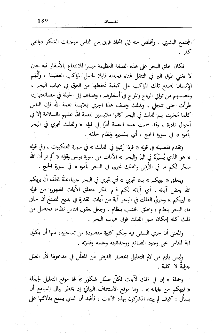 وَجُمْلَةُ إِنَّ فِي ذلِكَ لَآياتٍ لِكُلِّ صَبَّارٍ شَكُورٍ لَهَا مَوْقِعُ التَّعْلِيل لجملة لِيُرِيَكُمْ مِنْ آياتِهِ. وَلَهَا مَوْقِعُ الِاسْتِئْنَافِ الْبَيَانِيِّ إِذْ يَخْطُرُ بِبَالِ السَّامِعِ أَنْ يَسْأَلَ: كَيْفَ لَمْ يَهْتَدِ الْمُشْرِكُونَ بِهَذِهِ الْآيَاتِ؟ فَأُفِيدَ أَنَّ الَّذِي يَنْتَفِعُ بِدَلَالَتِهَا عَلَى