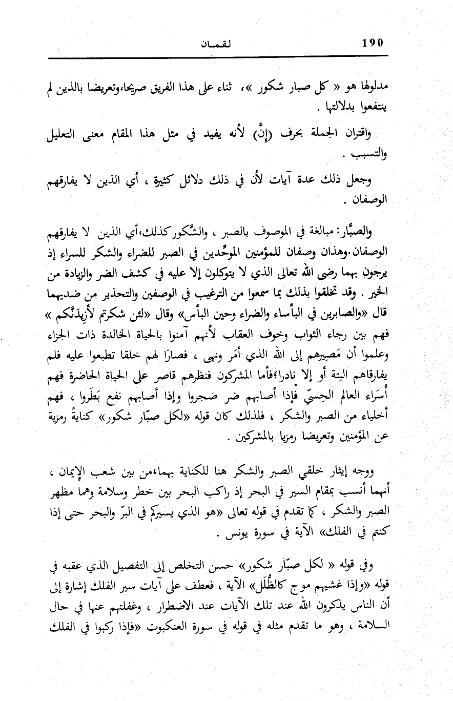 قَوْلُهُ لِكُلِّ صَبَّارٍ شَكُورٍ كِنَايَةً رَمْزِيَّةً عَنِ الْمُؤْمِنِينَ وَتَعْرِيضًا رَمْزِيًّا بِالْمُشْرِكِينَ. وَوَجْهُ إِيثَارِ خُلُقَيِ الصَّبْرِ وَالشُّكْرِ هُنَا لِلْكِنَايَةِ بِهِمَا، من بَين شُعَبِ الْإِيمَانِ، أَنَّهُمَا أَنْسَبُ بِمَقَامِ السَّيْرِ فِي الْبَحْرِ إِذْ رَاكِبُ الْبَحْرِ بَيْنَ خَطَرٍ وَسَلَامَةٍ وَهُمَا مَظْهَرُ الصَّبْرِ وَالشُّكْرِ، كَمَا تَقَدَّمَ فِي قَوْلِهِ تَعَالَى: هُوَ الَّذِي يُسَيِّرُكُمْ فِي الْبَرِّ وَالْبَحْرِ حَتَّى إِذا كُنْتُمْ فِي الْفُلْكِ الْآيَةَ فِي سُورَةِ يُونُسَ [22] .