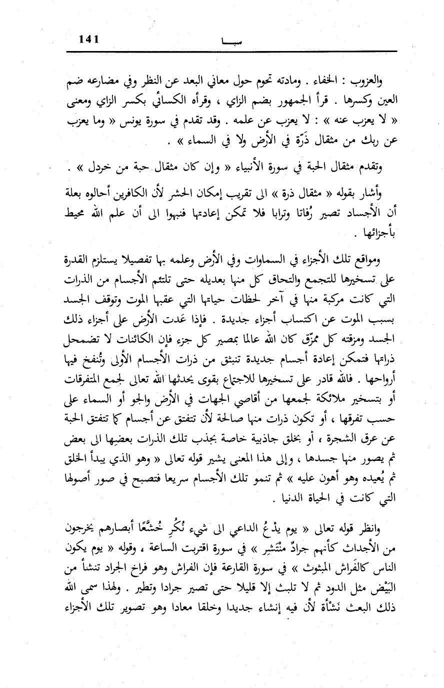وَأَشَارَ بِقَوْلِهِ: مِثْقالُ ذَرَّةٍ إِلَى تَقْرِيبِ إِمْكَانِ الْحَشْرِ لِأَنَّ الْكَافِرِينَ أَحَالُوهُ بِعِلَّةِ أَنَّ الْأَجْسَادَ تَصِيرُ رُفَاتًا وَتُرَابًا فَلَا تُمْكِنُ إِعَادَتُهَا فَنُبِّهُوا إِلَى أَنَّ عِلْمَ اللَّهِ مُحِيطٌ بِأَجْزَائِهَا.
