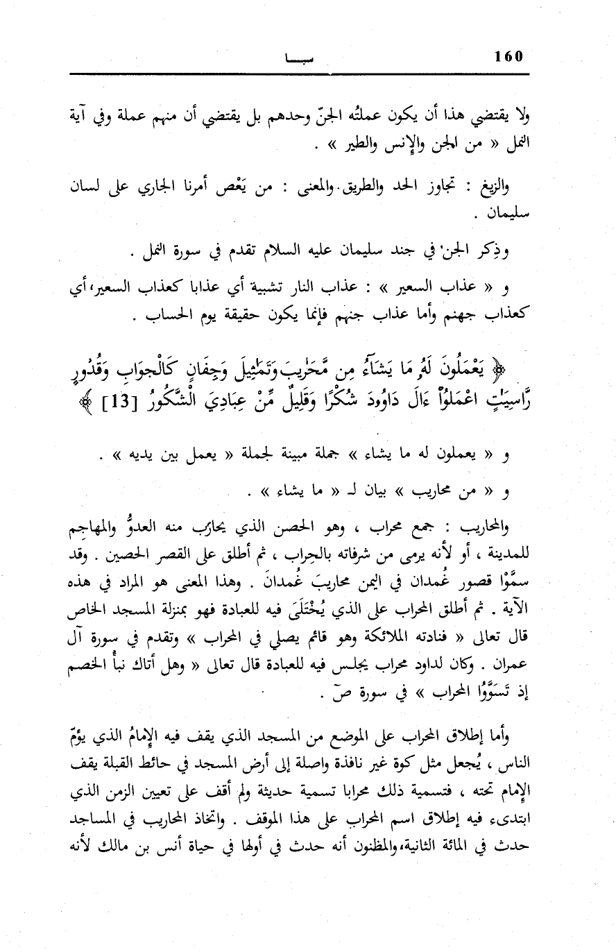 وَالْمَحَارِيبُ: جَمْعُ مِحْرَابٍ، وَهُوَ الْحِصْنُ الَّذِي يُحَارَبُ مِنْهُ الْعَدُوُّ وَالْمُهَاجِمُ لِلْمَدِينَةِ، أَوْ لِأَنَّهُ يُرْمَى مِنْ شُرُفَاتِهِ بِالْحِرَابِ، ثُمَّ أُطْلِقَ عَلَى الْقَصْرِ الْحَصِينِ. وَقَدْ سَمَّوْا قُصُورَ غُمْدَانَ فِي الْيَمَنِ مَحَارِيبَ غُمْدَانَ. وَهَذَا الْمَعْنَى هُوَ الْمُرَادُ فِي هَذِهِ الْآيَةِ. ثُمَّ أُطْلِقَ الْمِحْرَابُ عَلَى الَّذِي يُخْتَلَى فِيهِ لِلْعِبَادَةِ فَهْوَ بِمَنْزِلَةِ الْمَسْجِدِ الْخَاصِّ، قَالَ تَعَالَى: فَنادَتْهُ الْمَلائِكَةُ وَهُوَ قائِمٌ يُصَلِّي فِي الْمِحْرابِ وَتَقَدَّمَ فِي سُورَةِ آلِ عِمْرَانَ [39] . وَكَانَ لِدَاوُدَ مِحْرَابٌ يَجْلِسُ فِيهِ لِلْعِبَادَةِ قَالَ تَعَالَى: وَهَلْ أَتاكَ نَبَأُ الْخَصْمِ إِذْ تَسَوَّرُوا الْمِحْرابَ فِي سُورَةِ ص [21] .