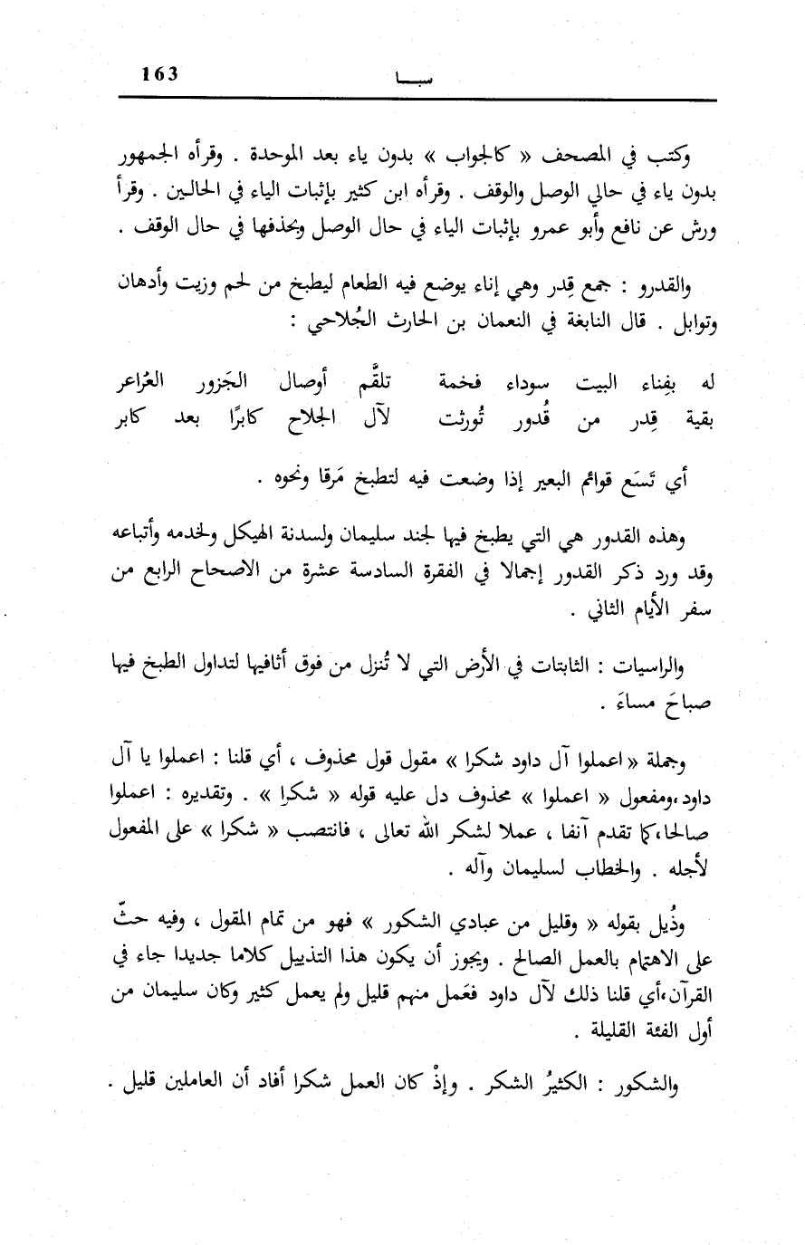 وَذُيِّلَ بِقَوْلِهِ: وَقَلِيلٌ مِنْ عِبادِيَ الشَّكُورُ فَهُوَ مِنْ تَمَامِ الْمَقُولِ، وَفِيهِ حَثٌّ عَلَى الِاهْتِمَامِ بِالْعَمَلِ الصَّالِحِ. وَيَجُوزُ أَنْ يَكُونَ هَذَا التَّذْيِيلُ كَلَامًا جَدِيدًا جَاءَ فِي الْقُرْآنِ، أَيْ قُلْنَا ذَلِكَ لِآلِ دَاوُدَ فَعَمِلَ مِنْهُمْ قَلِيلٌ وَلَمْ يَعْمَلْ كَثِيرٌ وَكَانَ سُلَيْمَانُ مِنْ أَوَّلِ الْفِئَةِ الْقَلِيلَةِ.