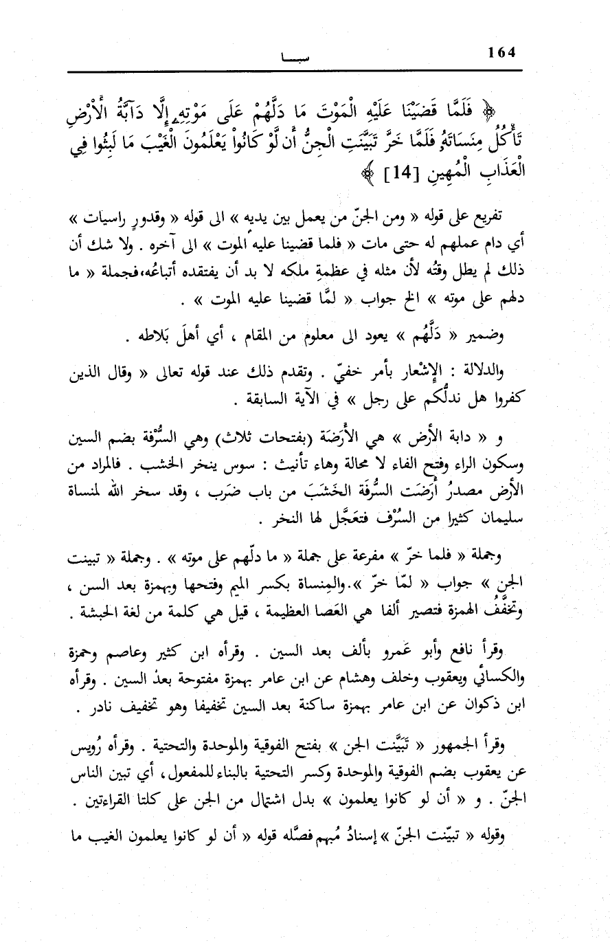 فَلَمَّا قَضَيْنا عَلَيْهِ الْمَوْتَ مَا دَلَّهُمْ عَلى مَوْتِهِ إِلاَّ دَابَّةُ الْأَرْضِ تَأْكُلُ مِنْسَأَتَهُ فَلَمَّا خَرَّ تَبَيَّنَتِ الْجِنُّ أَنْ لَوْ كانُوا يَعْلَمُونَ الْغَيْبَ مَا لَبِثُوا فِي الْعَذابِ الْمُهِينِ (14)
