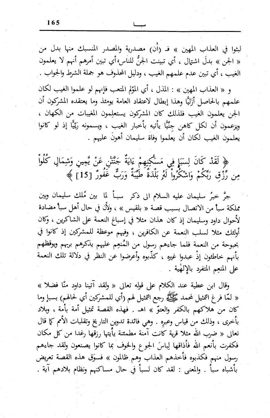 لَقَدْ كانَ لِسَبَإٍ فِي مَسْكَنِهِمْ آيَةٌ جَنَّتانِ عَنْ يَمِينٍ وَشِمالٍ كُلُوا مِنْ رِزْقِ رَبِّكُمْ وَاشْكُرُوا لَهُ بَلْدَةٌ طَيِّبَةٌ وَرَبٌّ غَفُورٌ (15)