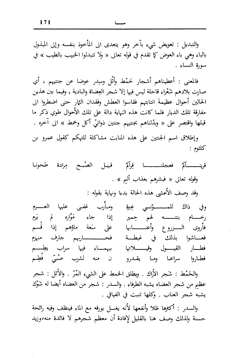 فَالْمَعْنَى: أَعْطَيْنَاهُمْ أَشْجَارَ خَمْطٍ وَأَثْلٍ وَسِدْرٍ عِوَضًا عَنْ جَنَّتَيْهِمْ، أَيْ صَارَت بِلَادهمْ شعراء قَاحِلَةً لَيْسَ فِيهَا إِلَّا شَجَرُ الْعِضَاةِ وَالْبَادِيَةِ، وَفِيمَا بَيْنَ هَذَيْنِ الْحَالَيْنِ أَحْوَالٌ عَظِيمَةٌ انْتَابَتْهُمْ فَقَاسَوُا الْعَطَشَ وَفِقْدَانَ الثِّمَارِ حَتَّى اضْطُرُّوا إِلَى مُفَارَقَةِ تِلْكَ الدِّيَارِ، فَلَمَّا كَانَتْ هَذِهِ النِّهَايَةُ دَالَّةً عَلَى تِلْكَ الْأَحْوَالِ طُوِيَ ذِكْرُ مَا قَبْلَهَا وَاقْتُصِرَ عَلَى وَبَدَّلْناهُمْ بِجَنَّتَيْهِمْ