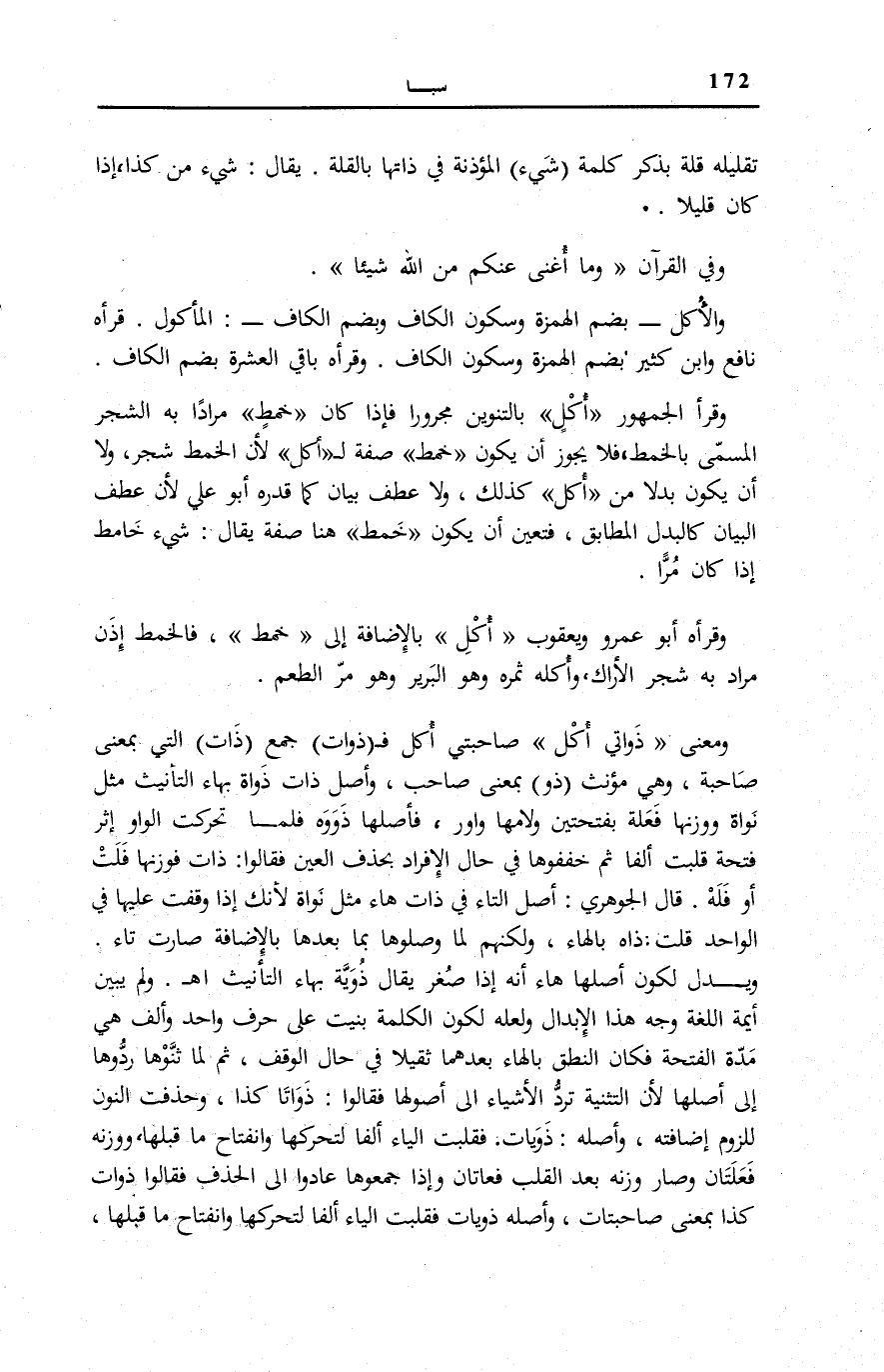 وَقَرَأَ الْجُمْهُورُ أُكُلٍ بِالتَّنْوِينِ مَجْرُورًا فَإِذَا كَانَ خَمْطٍ مُرَادًا بِهِ الشَّجَرُ الْمُسَمَّى بِالْخَمْطِ، فَلَا يَجُوزُ أَنْ يَكُونَ خَمْطٍ صِفَةً لِ أُكُلٍ لِأَنَّ الْخَمْطَ شَجَرٌ، وَلَا أَنْ يَكُونَ بَدَلًا مِنْ أُكُلٍ كَذَلِكَ، وَلَا عَطْفَ بَيَانٍ كَمَا قَدَّرَهُ أَبُو عَلِيٍّ لِأَنَّ عَطْفَ الْبَيَانِ كَالْبَدَلِ الْمُطَابِقِ، فَتَعَيَّنَ أَنْ يَكُونَ خَمْطٍ هُنَا صِفَةً يُقَالُ: شَيْءٌ خَامِطٌ إِذَا كَانَ مُرًّا.