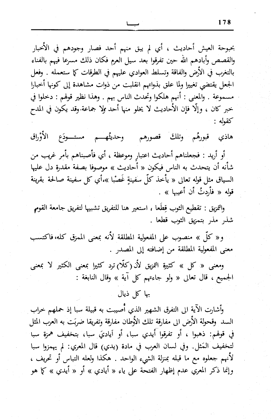 بِهَا كُلُّ ذَيَّالٍ وَأَشَارَتِ الْآيَةُ إِلَى التَّفَرُّقِ الشَّهِيرِ الَّذِي أُصِيبَتْ بِهِ قَبِيلَةُ سَبَأٍ إِذْ حَمَلَهُمْ خَرَابُ السَّدِّ وَقُحُولَةُ الْأَرْضِ إِلَى مُفَارَقَةِ تِلْكَ الْأَوْطَانِ مُفَارَقَةً وَتَفْرِيقًا ضَرَبَتْ بِهِ الْعَرَبُ الْمَثَلَ فِي قَوْلِهِمْ: ذَهَبُوا، أَوْ تَفَرَّقُوا أَيْدِي سَبَا، أَوْ آيَادِيَ سَبَا، بِتَخْفِيفِ هَمْزَةِ سَبَأٍ لِتَخْفِيفِ الْمَثَلِ.