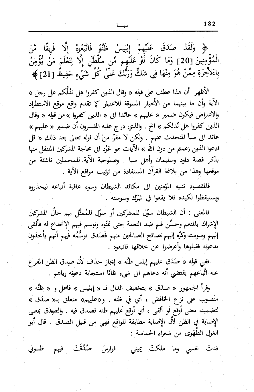 وَقَرَأَ الْجُمْهُورُ صَدَّقَ بِتَخَفِيفِ الدَّالِ فَ إِبْلِيسُ فَاعِلٌ وظَنَّهُ مَنْصُوبٌ عَلَى نَزْعِ الْخَافِضِ، أَيْ فِي ظَنِّهِ. وعَلَيْهِمْ مُتَعَلِّقٌ بِ صَدَّقَ لِتَضْمِينِهِ مَعْنَى أَوْقَعَ أَوْ أَلْقَى، أَيْ أَوْقَعَ عَلَيْهِمْ ظَنَّهُ فَصَدَقَ فِيهِ. وَالصِّدْقُ بِمَعْنَى الْإِصَابَةِ فِي الظَّنِّ لِأَنَّ الْإِصَابَةَ مُطَابِقَةٌ لِلْوَاقِعِ فَهِيَ مِنْ قَبِيلِ الصِّدْقِ. قَالَ أَبُو الْغُولِ الطُّهَوِيُّ مِنْ شُعَرَاءِ الْحَمَاسَةِ: