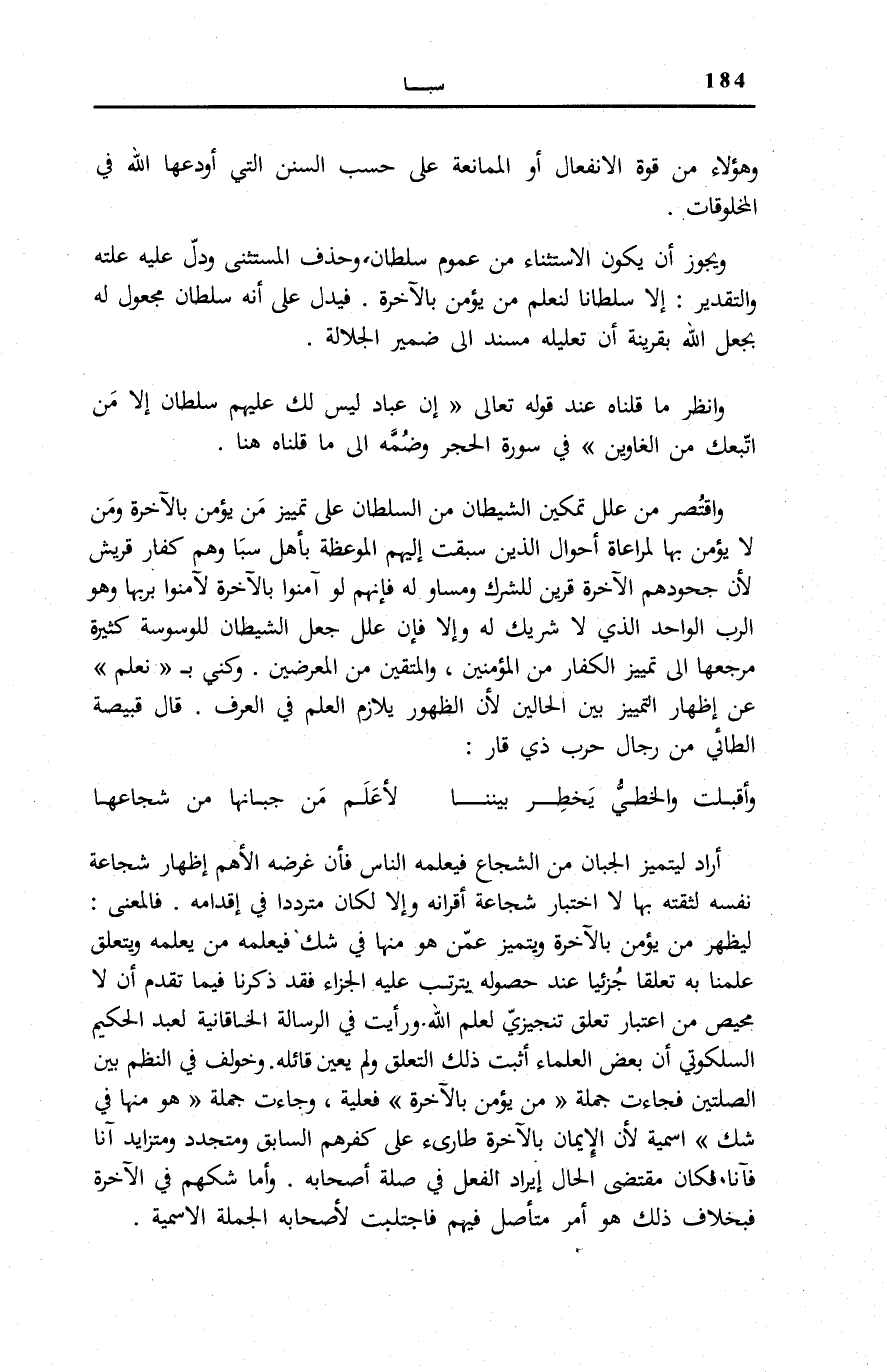 وَاقْتُصِرَ مَنْ عَلَّلَ تَمْكِينِ الشَّيْطَانِ مِنَ السُّلْطَانِ عَلَى تَمْيِيزِ مَنْ يُؤْمِنُ بِالْآخِرَةِ وَمَنْ لَا يُؤْمِنُ بِهَا لِمُرَاعَاةِ أَحْوَالِ الَّذِينَ سَبَقَتْ إِلَيْهِمُ الْمَوْعِظَةُ بِأَهْلِ سَبَإٍ وَهُمْ كُفَّارُ قُرَيْشٍ لِأَن جحودهم الْآخِرَة قَرِينٌ لِلشِّرْكِ وَمُسَاوٍ لَهُ فَإِنَّهُمْ لَوْ آمَنُوا بِالْآخِرَةِ لَآمَنُوا بِرَبِّهَا وَهُوَ الرَّبُّ الْوَاحِدُ الَّذِي لَا شَرِيكَ لَهُ، وَإِلَّا فَإِنَّ عِلَلَ جَعْلِ الشَّيْطَانِ لِلْوَسْوَسَةِ كَثِيرَةٌ مَرْجِعُهَا إِلَى تَمْيِيزِ الْكُفَّارِ مِنَ الْمُؤْمِنِينَ، وَالْمُتَّقِينَ مِنَ الْمُعْرِضِينَ. وَكُنِّيَ بِ «نَعْلَمَ» عَنْ إِظْهَارِ التَّمْيِيزِ بَيْنَ الْحَالَيْنِ لِأَنَّ الظُّهُورَ يُلَازِمُ الْعِلْمَ فِي الْعرف. قَالَ قبيضة الطَّائِيُّ مِنْ رِجَالِ حَرْبِ ذِي قَارٍ:
