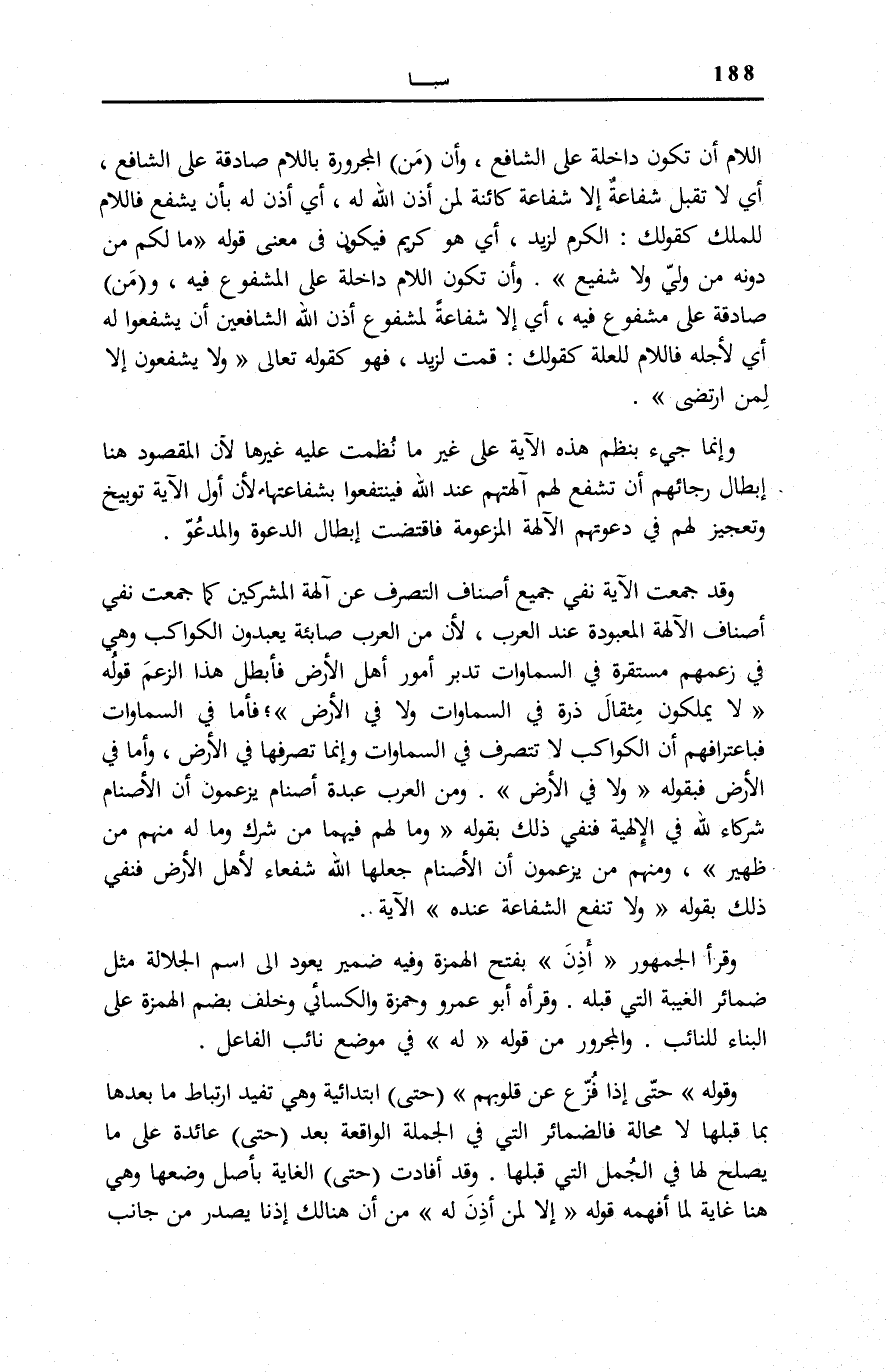 اللَّامُ أَنْ تَكُونَ دَاخِلَةً عَلَى الشَّافِعِ، وَأَنَّ (مَنِ) الْمَجْرُورَةَ بِاللَّامِ صَادِقَةٌ عَلَى الشَّافِعِ، أَيْ لَا تُقْبَلُ شَفَاعَةٌ إِلَّا شَفَاعَةٌ كَائِنَةٌ لِمَنْ أَذِنَ اللَّهُ لَهُ، أَيْ أَذِنَ لَهُ بِأَنْ يَشْفَعَ فَاللَّام للْملك كَقَوْلِك: الْكَرَمُ لِزَيْدٍ، أَيْ هُوَ كَرِيمٌ فَيَكُونُ فِي مَعْنَى قَوْلِهِ: مَا لَكُمْ مِنْ دُونِهِ مِنْ وَلِيٍّ وَلا شَفِيعٍ [السَّجْدَة: 4] . وَأَنْ