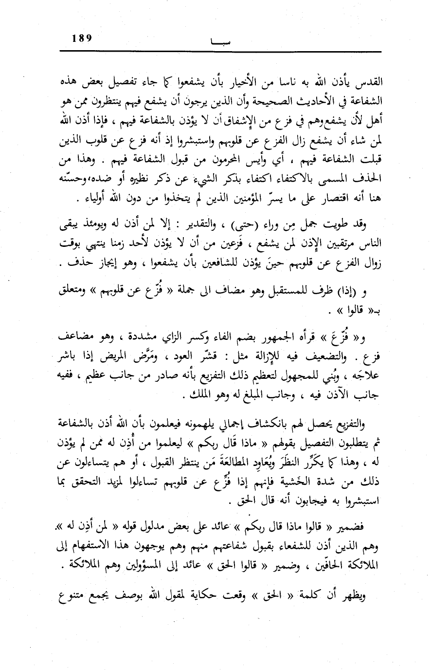 وَالتَّفْزِيعُ يَحْصُلُ لَهُمْ بِانْكِشَافٍ إِجْمَالِيٍّ يُلْهَمُونَهُ فَيَعْلَمُونَ بِأَنَّ اللَّهَ أَذِنَ بِالشَّفَاعَةِ ثُمَّ يَتَطَلَّبُونَ التَّفْصِيلَ بِقَوْلِهِمْ: مَاذَا قالَ رَبُّكُمْ لِيَعْلَمُوا مَنْ أَذِنَ لَهُ مِمَّنْ لَمْ يُؤْذَنْ لَهُ، وَهَذَا كَمَا يُكَرِّرُ النَّظَرَ وَيُعَاوِدُ الْمُطَالَعَةَ مَنْ يَنْتَظِرُ الْقَبُولَ، أَوْ هُمْ يَتَسَاءَلُونَ عَنْ ذَلِكَ مِنْ شِدَّةِ الْخَشْيَةِ فَإِنَّهُمْ إِذَا فُزِّعَ عَنْ قُلُوبِهِمْ تساءلوا لمزيد التحقق بِمَا اسْتَبْشَرُوا بِهِ فَيُجَابُونَ أَنَّهُ قَالَ الْحَقَّ.