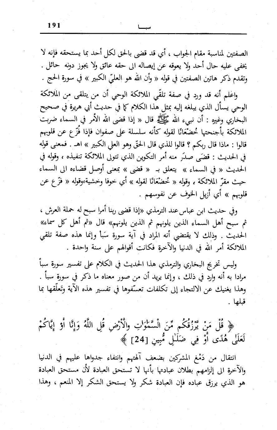 وَلَيْسَ تَخْرِيجُ الْبُخَارِيِّ وَالتِّرْمِذِيِّ هَذَا الْحَدِيثَ فِي الْكَلَامِ عَلَى تَفْسِيرِ سُورَةِ سَبَأٍ مُرَادًا بِهِ أَنَّهُ وَارِدٌ فِي ذَلِكَ، وَإِنَّمَا يُرِيدُ أَنَّ مِنْ صُوَرِ مَعْنَاهُ مَا ذُكِرَ فِي سُورَةِ سَبَأٍ. وَهَذَا يُغْنِيكَ عَنِ الِالْتِجَاءِ إِلَى تَكَلُّفَاتٍ تَعَسَّفُوهَا فِي تَفْسِيرِ هَذِهِ الْآيَةِ وَتَعَلُّقِهَا بِمَا قبلهَا.