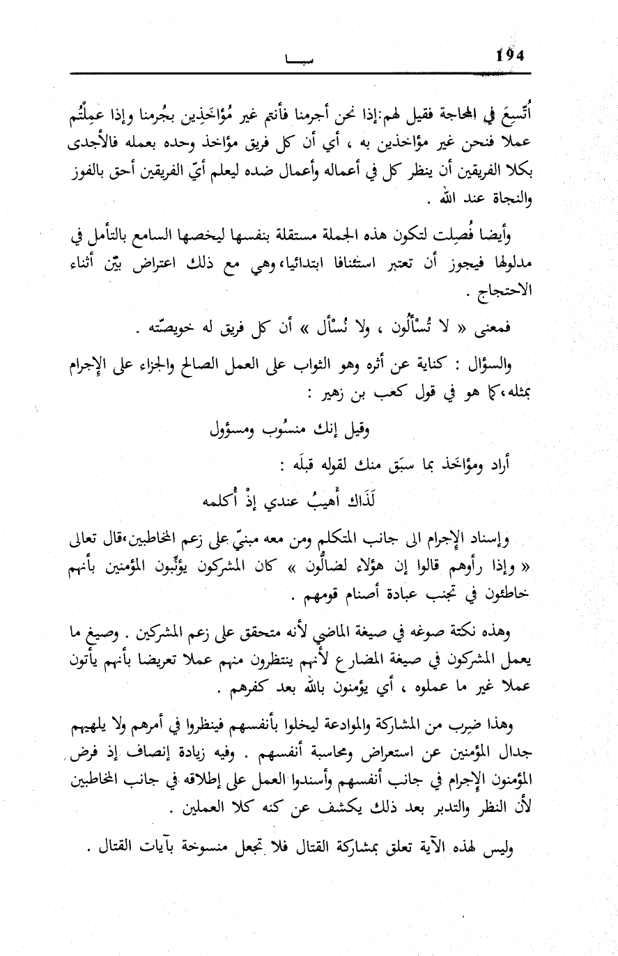 وَهَذَا ضَرْبٌ مِنَ الْمُشَارَكَةِ وَالْمُوَادَعَةِ لِيَخْلُوَا بِأَنْفُسِهِمْ فَيَنْظُرُوا فِي أَمْرِهِمْ وَلَا يُلْهِيَهِمْ جِدَالُ الْمُؤْمِنِينَ عَنِ اسْتِعْرَاضِ ومحاسبة أنفسهم. وَفِيه زِيَادَة إنصاف إِذْ فرض الْمُؤْمِنُونَ الإجرام فِي جَانب أَنْفُسِهِمْ وَأَسْنَدُوا الْعَمَلَ عَلَى إِطْلَاقِهِ فِي جَانِبِ الْمُخَاطَبِينَ لِأَنَّ النَّظَرَ وَالتَّدَبُّرَ بَعْدَ ذَلِكَ يَكْشِفُ عَنْ كُنْهِ كِلَا الْعَمَلَيْنِ.