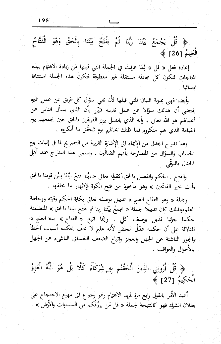 قُلْ يَجْمَعُ بَيْنَنا رَبُّنا ثُمَّ يَفْتَحُ بَيْنَنا بِالْحَقِّ وَهُوَ الْفَتَّاحُ الْعَلِيمُ (26)
