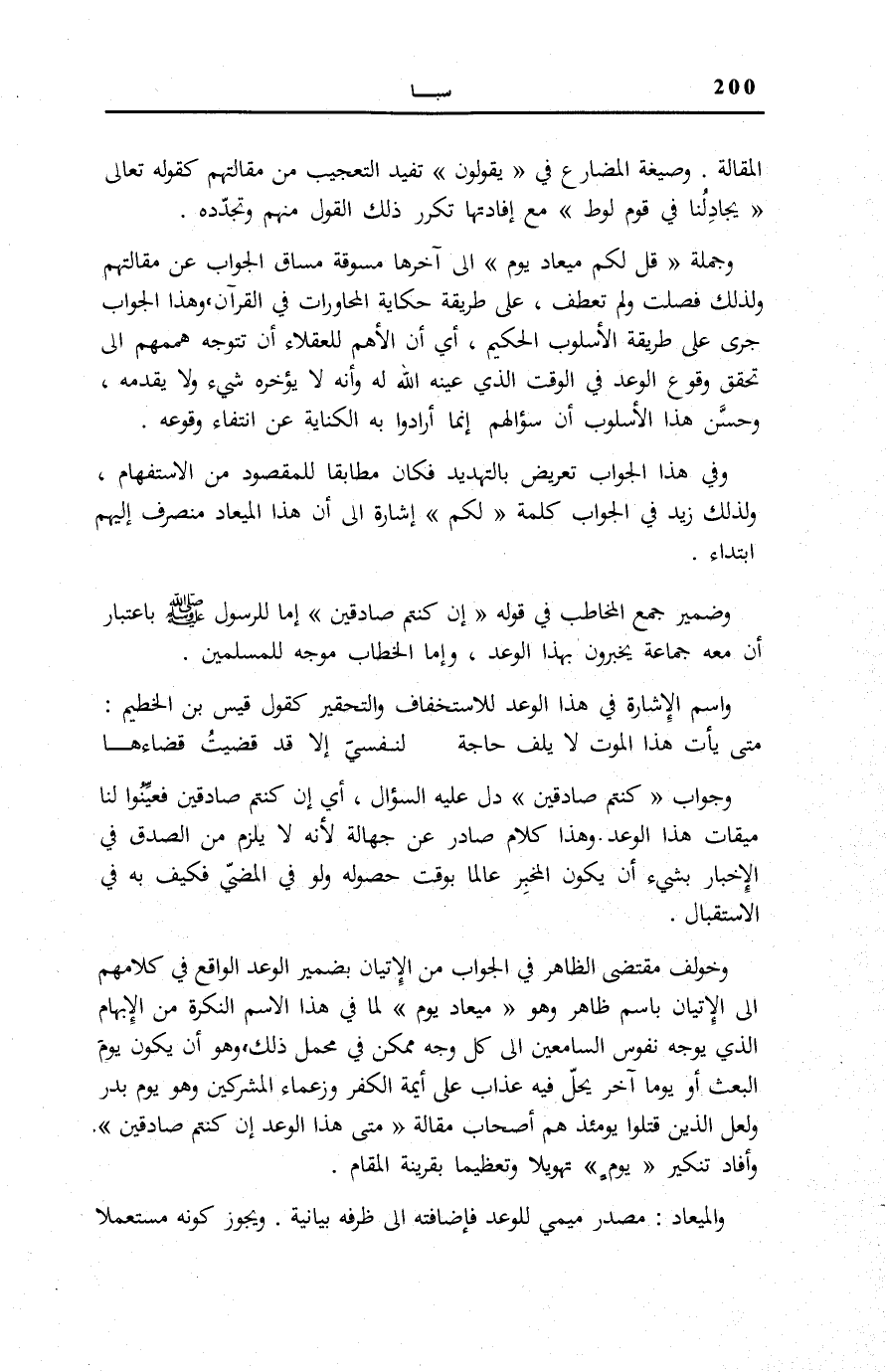 وَخُولِفَ مُقْتَضَى الظَّاهِرِ فِي الْجَوَابِ مِنَ الْإِتْيَانِ بِضَمِيرِ الْوَعْدِ الْوَاقِعِ فِي كَلَامِهِمْ إِلَى الْإِتْيَانِ بَاسِمٍ ظَاهِرٍ وَهُوَ مِيعادُ يَوْمٍ لِمَا فِي هَذَا الِاسْمِ النَّكِرَةِ مِنَ الْإِبْهَامِ الَّذِي يُوَجِّهُ نُفُوسَ السَّامِعِينَ إِلَى كُلِّ وَجْهٍ مُمْكِنٍ فِي مَحْمَلِ ذَلِكَ، وَهُوَ أَنْ يَكُونَ يَوْمُ الْبَعْثِ أَوْ يَوْمًا آخَرَ يَحِلُّ فِيهِ عَذَاب على أيمة الْكُفْرِ وَزُعَمَاءِ الْمُشْرِكِينَ وَهُوَ يَوْمُ بَدْرٍ وَلَعَلَّ الَّذِينَ قُتِلُوا يَوْمَئِذٍ هُمْ أَصْحَابُ مَقَالَةِ مَتى هذَا الْوَعْدُ إِنْ كُنْتُمْ صادِقِينَ وَأَفَادَ تَنْكِيرُ يَوْمٍ تَهْوِيلًا وَتَعْظِيمًا بِقَرِينَةِ الْمَقَامِ.