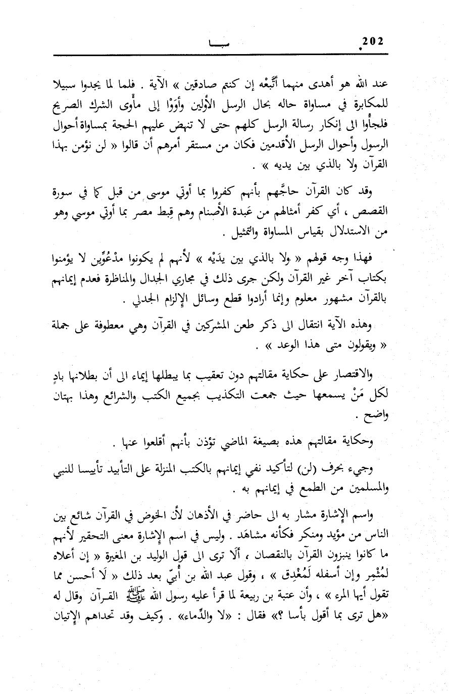 فَهَذَا وَجْهُ قَوْلِهِمْ: وَلا بِالَّذِي بَيْنَ يَدَيْهِ لِأَنَّهُمْ لَمْ يَكُونُوا مدعوّين لَا يُؤمنُوا بِكِتَابٍ آخَرَ غَيْرِ الْقُرْآنِ وَلَكِنْ جَرَى ذَلِكَ فِي مَجَارِي الْجِدَالِ وَالْمُنَاظَرَةِ فَعَدَمُ إِيمَانِهِمْ بِالْقُرْآنِ مَشْهُورٌ مَعْلُومٌ وَإِنَّمَا أَرَادُوا قَطْعَ وَسَائِلِ الْإِلْزَامِ الْجَدَلِيِّ.