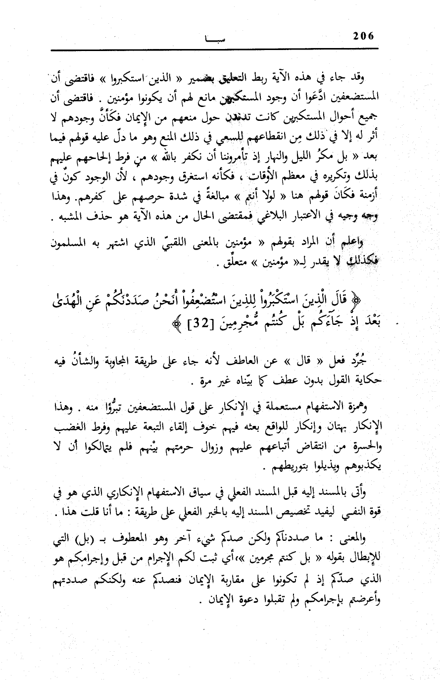 الْمُسْتَكْبِرِينَ كَانَتْ تُدَنْدِنُ حَوْلَ مَنعهم من الْإِيمَان فَكَانَ وَجُودُهُمْ لَا أَثَرَ لَهُ إِلَّا فِي ذَلِك من انقطاعهم للسعي فِي ذَلِكَ الْمَنْعِ وَهُوَ مَا دَلَّ عَلَيْهِ قَوْلُهُمْ فِيمَا بَعْدَ بَلْ مَكْرُ اللَّيْلِ وَالنَّهارِ إِذْ تَأْمُرُونَنا أَنْ نَكْفُرَ بِاللَّهِ [سبأ: 33] مِنْ فَرْطِ إِلْحَاحِهِمْ عَلَيْهِمْ بِذَلِكَ وَتَكْرِيرِهِ فِي مُعْظَمِ الْأَوْقَاتِ، فَكَأَنَّهُ اسْتَغْرَقَ وُجُودَهُمْ، لِأَنَّ الْوُجُودَ كَوْنٌ فِي أَزْمِنَةٍ فَكَانَ قَوْلُهُمْ هُنَا لَوْلا أَنْتُمْ مُبَالَغَةً فِي شِدَّةِ حِرْصِهِمْ عَلَى كُفْرِهِمْ. وَهَذَا وَجْهٌ وَجِيهٌ فِي الِاعْتِبَارِ الْبَلَاغِيِّ فَمُقْتَضَى الْحَالِ مِنْ هَذِهِ الْآيَةِ هُوَ حَذْفُ الْمُشَبَّهِ.