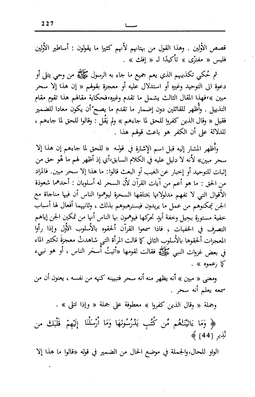 ثُمَّ حُكِيَ تَكْذِيبُهُمُ الَّذِي يَعُمُّ جَمِيعَ مَا جَاءَ بِهِ الرَّسُولُ صَلَّى اللهُ عَلَيْهِ وَسَلَّمَ مِنْ وَحْيٍ يُتْلَى أَوْ دَعْوَةٍ إِلَى التَّوْحِيدِ وَغَيْرِهِ أَوِ اسْتِدْلَالٍ عَلَيْهِ أَوْ مُعْجِزَةٍ بِقَوْلِهِمْ: إِنْ هَذَا إِلَّا سِحْرٌ مُبِينٌ، فَهَذَا الْمَقَالُ الثَّالِثُ يَشْمَلُ مَا تَقَدَّمَ وَغَيْرَهُ، فَحِكَايَةُ مَقَالِهِمْ هَذَا تَقُومُ مَقَامَ التَّذْيِيلِ. وَأُظْهِرَ لِلْقَائِلِينَ دُونَ إِضْمَارِ مَا تَقَدَّمَ مَا يَصِحُّ أَنْ يَكُونَ مَعَادًا لِلضَّمِيرِ فَقِيلَ: وَقالَ الَّذِينَ كَفَرُوا لِلْحَقِّ لَمَّا جاءَهُمْ وَلَمْ يَقُلْ: وَقَالُوا لِلْحَقِّ لَمَّا جَاءَهُمْ، لِلدَّلَالَةِ عَلَى أَنَّ الْكُفْرَ هُوَ بَاعِثُ قَوْلِهِمْ هَذَا.