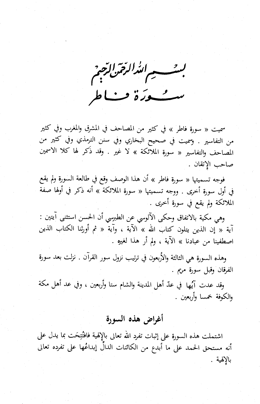 أَغْرَاضُ هَذِهِ السُّورَةِ اشْتَمَلَتْ هَذِهِ السُّورَةُ عَلَى إِثْبَاتِ تَفَرُّدِ اللَّهِ تَعَالَى بِالْإِلَهِيَّةِ فَافْتُتِحَتْ بِمَا يَدُلُّ عَلَى أَنَّهُ مُسْتَحِقٌّ الْحَمْدَ عَلَى مَا أَبْدَعَ مِنَ الْكَائِنَاتِ الدَّالِّ إِبْدَاعُهَا عَلَى تَفَرُّدِهِ تَعَالَى بِالْإِلَهِيَّةِ.