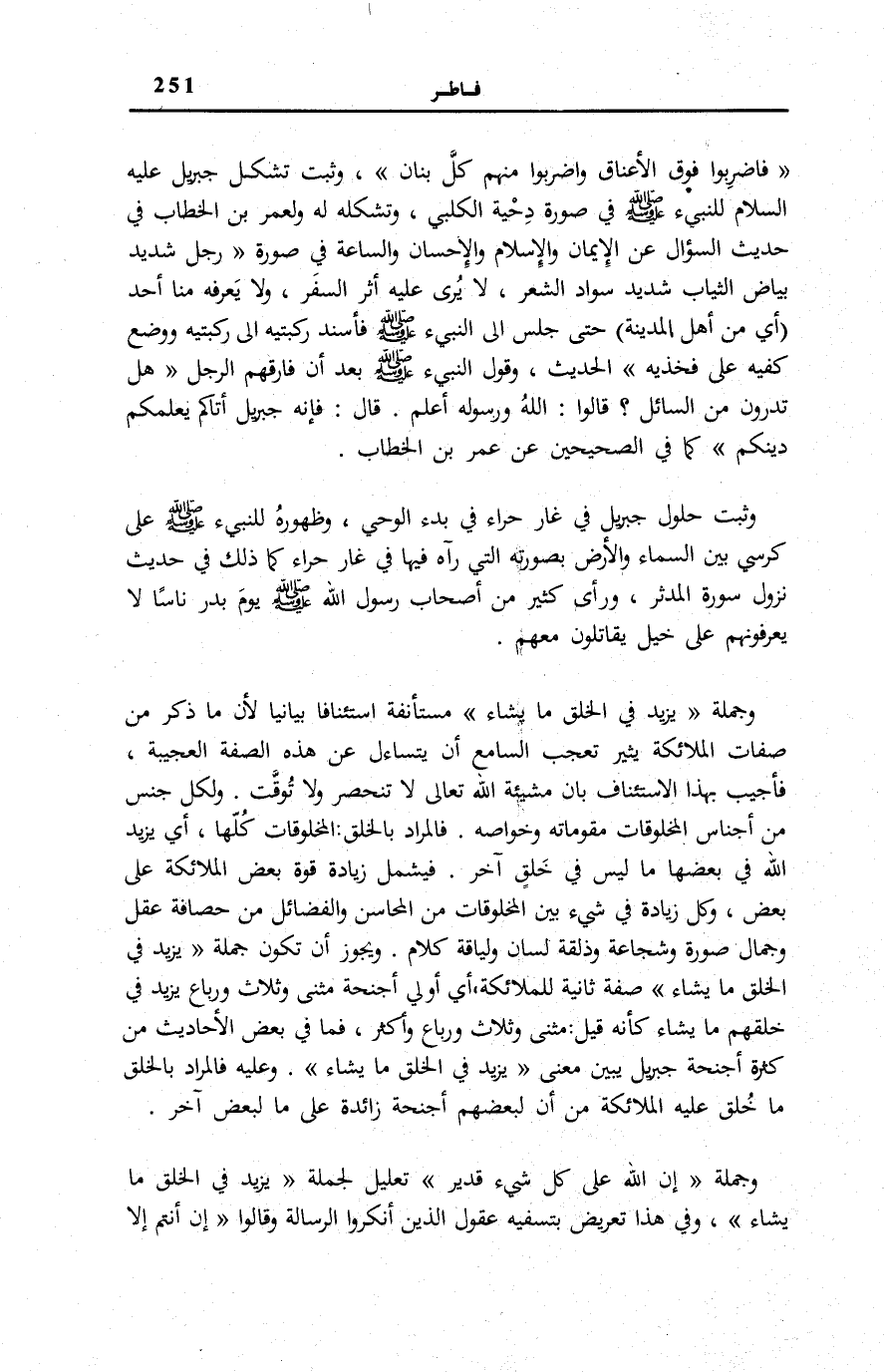 وَيَجُوزُ أَنْ تَكُونَ جُمْلَةُ يَزِيدُ فِي الْخَلْقِ مَا يَشاءُ صِفَةً ثَانِيَةً لِلْمَلَائِكَةِ، أَيْ أُولِي أَجْنِحَةٍ مَثْنَى وَثُلَاثَ وَرُبَاعَ يَزِيدُ فِي خَلْقِهِمْ مَا يَشَاءُ كَأَنَّهُ قِيلَ: مَثْنَى وَثُلَاثَ وَرُبَاعَ وَأَكْثَرَ، فَمَا فِي بَعْضِ الْأَحَادِيثِ مِنْ كَثْرَةِ أَجْنِحَةِ جِبْرِيلَ يُبَيِّنُ مَعْنَى يَزِيدُ فِي الْخَلْقِ مَا يَشاءُ. وَعَلَيْهِ فَالْمُرَادُ بِالْخَلْقِ مَا خُلِقَ عَلَيْهِ الْمَلَائِكَةُ مِنْ أَنَّ لِبَعْضِهِمْ أَجْنِحَةً زَائِدَة على من لِبَعْضٍ آخَرَ.