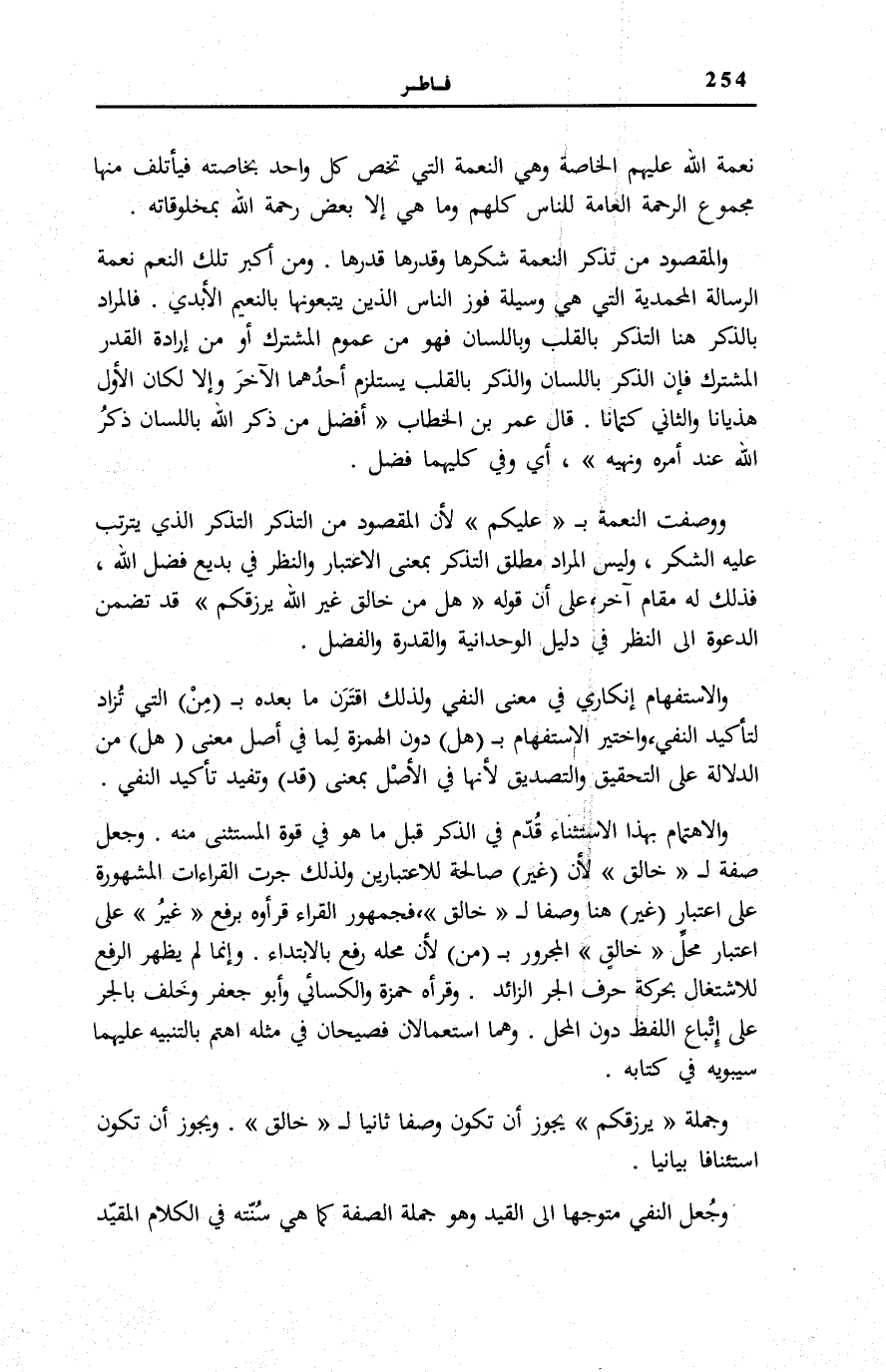 وَالِاهْتِمَامُ بِهَذَا الِاسْتِثْنَاءِ قُدِّمَ فِي الذِّكْرِ قَبْلَ مَا هُوَ فِي قُوَّةِ الْمُسْتَثْنَى مِنْهُ. وَجُعِلَ صِفَةً لِ خالِقٍ لِأَنَّ غَيْرُ صَالِحَةٌ لِلِاعْتِبَارَيْنِ وَلِذَلِكَ جَرَتِ الْقِرَاءَاتُ الْمَشْهُورَةُ عَلَى اعْتِبَارِ غَيْرُ هُنَا وَصْفًا لِ خالِقٍ، فجمهور الْقُرَّاء قرأوه بِرَفْعِ غَيْرُ عَلَى اعْتِبَارِ مَحَلِّ خالِقٍ الْمَجْرُورِ بِ مِنْ لِأَنَّ مَحَلَّهُ رَفْعٌ بِالِابْتِدَاءِ. وَإِنَّمَا لَمْ يَظْهَرِ الرَّفْعُ لِلِاشْتِغَالِ بِحَرَكَةِ حَرْفِ الْجَرِّ الزَّائِدِ. وَقَرَأَهُ حَمْزَةُ وَالْكِسَائِيُّ وَأَبُو جَعْفَرٍ وَخَلَفٌ بِالْجَرِّ عَلَى إِتْبَاعِ اللَّفْظِ دُونَ الْمَحَلِّ. وَهُمَا اسْتِعْمَالَانِ فَصِيحَانِ فِي مِثْلِهِ اهْتَمَّ بِالتَّنْبِيهِ عَلَيْهِمَا سِيبَوَيْهِ فِي «كِتَابِهِ» .
