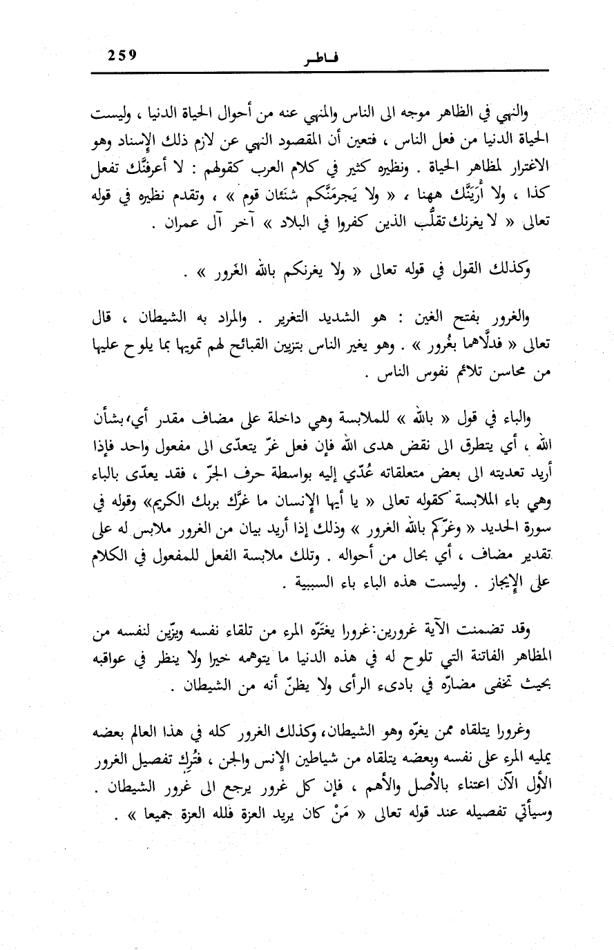 وَكَذَلِكَ الْقَوْلُ فِي قَوْلِهِ تَعَالَى: وَلا يَغُرَّنَّكُمْ بِاللَّهِ الْغَرُورُ.
