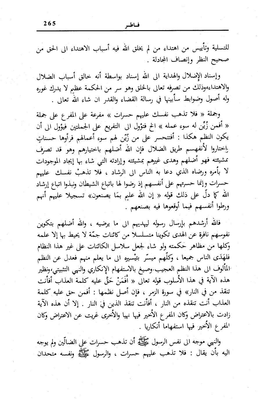 أَفَتَتَحَسَّرُ عَلَى مَنْ زُيِّنَ لَهُمْ سُوءُ أَعْمَالِهِمْ فَرَأَوْهَا حَسَنَاتٍ وَاخْتَارُوا لِأَنْفُسِهِمْ طَرِيقَ الضَّلَالِ فَإِنَّ اللَّهَ أَضَلَّهُمْ بِاخْتِيَارِهِمْ وَهُوَ قَدْ تَصَرَّفَ بِمَشِيئَتِهِ فَهُوَ أَضَلَّهُمْ وَهُدَى غَيْرَهُمْ بِمَشِيئَتِهِ وَإِرَادَتِهِ الَّتِي شَاءَ بِهَا إِيجَادَ الْمَوْجُودَاتِ لَا بِأَمْرِهِ وَرِضَاهُ الَّذِي دَعَا بِهِ النَّاسَ إِلَى الرَّشَادِ، فَلَا تَذْهَبْ نَفْسُكَ عَلَيْهِمْ حَسَرَاتٍ وَإِنَّمَا حَسْرَتُهُمْ عَلَى أَنْفُسِهِمْ إِذْ رَضُوا لَهَا بِاتِّبَاعِ الشَّيْطَانِ وَنَبَذُوا اتِّبَاعَ إِرْشَادِ اللَّهِ كَمَا دَلَّ عَلَى ذَلِكَ قَوْلُهُ: إِنَّ اللَّهَ عَلِيمٌ بِما يَصْنَعُونَ تَسْجِيلًا عَلَيْهِمْ أَنَّهُمْ وَرَّطُوا أَنْفُسَهُمْ فِيمَا أَوْقَعُوهَا فِيهِ بِصُنْعِهِمْ.
