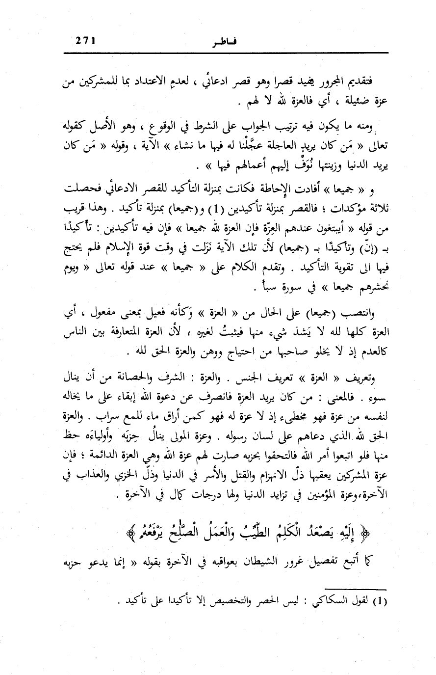 وجَمِيعاً أَفَادَتِ الْإِحَاطَةَ فَكَانَتْ بِمَنْزِلَةِ التَّأْكِيدِ لِلْقَصْرِ الِادِّعَائِيِّ فَحَصَلَتْ ثَلَاثَةُ مُؤَكِّدَاتٍ فَالْقَصْرُ بِمَنْزِلَةِ تَأْكِيدَيْنِ (¬1) وجَمِيعاً بِمَنْزِلَةِ تَأْكِيدٍ. وَهَذَا قَرِيبٌ مِنْ قَوْلِهِ أَيَبْتَغُونَ عِنْدَهُمُ الْعِزَّةَ فَإِنَّ الْعِزَّةَ لِلَّهِ جَمِيعاً [النِّسَاء: 139] فَإِنَّ فِيهِ تَأْكِيدَيْنِ: تَأْكِيدًا بِ (إِنَّ) وَتَأْكِيدًا بِ جَمِيعاً لِأَنَّ تِلْكَ الْآيَةَ نَزَلَتْ فِي وَقْتِ قُوَّةِ الْإِسْلَامِ فَلَمْ يَحْتَجْ فِيهَا إِلَى تَقْوِيَةِ التَّأْكِيدِ. وَتَقَدَّمَ الْكَلَامُ عَلَى جَمِيعاً عِنْدَ قَوْلِهِ تَعَالَى: وَيَوْمَ يَحْشُرُهُمْ جَمِيعاً فِي سُورَةِ سَبَأٍ [40] .