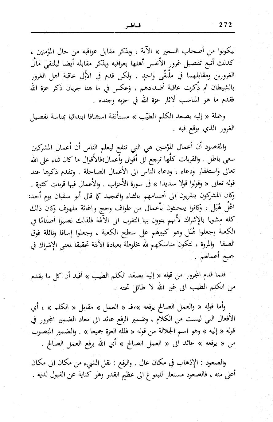 وَأَمَّا قَوْلُهُ: وَالْعَمَلُ الصَّالِحُ يَرْفَعُهُ فَ الْعَمَلُ مُقَابِلُ الْكَلِمُ، أَيِ الْأَفْعَالُ الَّتِي لَيْسَتْ مِنَ الْكَلَامِ، وَضَمِيرُ الرَّفْعِ عَائِدٌ إِلَى مَعَادِ الضَّمِيرِ الْمَجْرُورِ فِي قَوْلِهِ: إِلَيْهِ وَهُوَ اسْمُ الْجَلَالَةِ مِنْ قَوْلِهِ فَلِلَّهِ الْعِزَّةُ جَمِيعاً. وَالضَّمِيرُ الْمَنْصُوبُ مِنْ يَرْفَعُهُ عَائِدٌ إِلَى الْعَمَلُ الصَّالِحُ أَيِ اللَّهُ يَرْفَعُ الْعَمَلَ الصَّالِحَ.