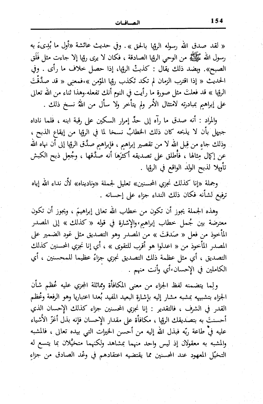 اللَّهِ لَا مِنْ تَقْصِيرِ إِبْرَاهِيمَ، فَإِبْرَاهِيمُ صَدَّقَ الرُّؤْيَا إِلَى أَنْ نَهَاهُ اللَّهُ عَنْ إِكْمَالِ مِثَالِهَا، فَأُطْلِقَ عَلَى تَصْدِيقِهِ أَكْثَرَهَا أَنَّهُ صَدَّقَهَا، وَجُعِلَ ذَبْحُ الْكَبْشِ تَأْوِيلًا لِذَبْحِ الْوَلَدِ الْوَاقِعِ فِي الرُّؤْيَا.