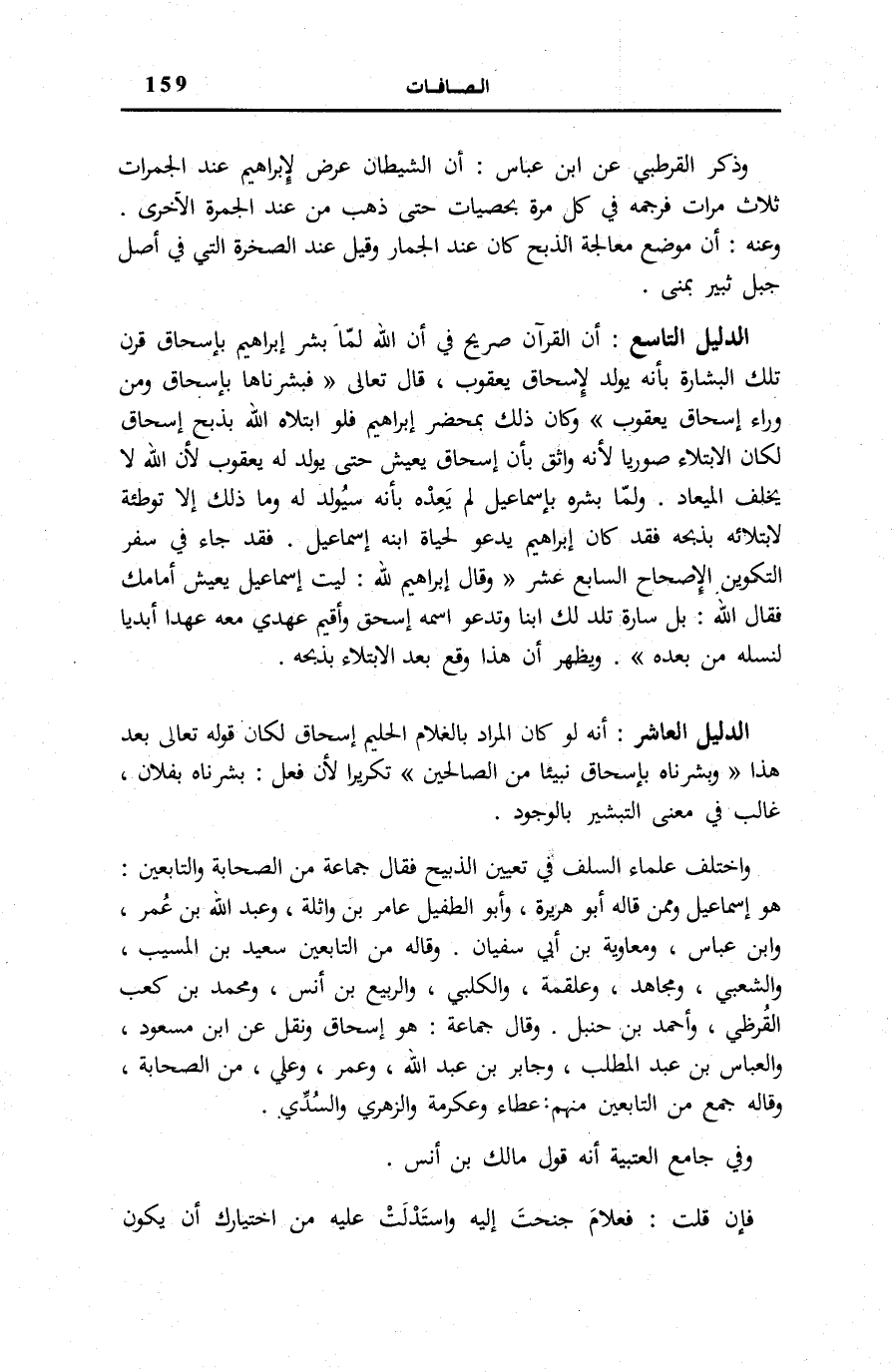 وَاخْتَلَفَ عُلَمَاءُ السَّلَفِ فِي تَعْيِينِ الذَّبِيحِ فَقَالَ جَمَاعَةٌ مِنَ الصَّحَابَةِ وَالتَّابِعِينَ: هُوَ إِسْمَاعِيلُ وَمِمَّنْ قَالَهُ أَبُو هُرَيْرَةَ وَأَبُو الطُّفَيْلِ عَامِرُ بْنُ وَاثِلَةَ وَعَبْدُ اللَّهِ بْنُ عُمَرَ وَابْنُ عَبَّاسٍ وَمُعَاوِيَةُ بْنُ أَبِي سُفْيَانَ. وَقَالَهُ مِنَ التَّابِعِينَ سَعِيدُ بْنُ الْمُسَيَّبِ وَالشَّعْبِيُّ وَمُجَاهِدٌ وَعَلْقَمَةُ وَالْكَلْبِيُّ وَالرَّبِيعُ بْنُ أَنَسٍ وَمُحَمَّدُ بْنُ كَعْبٍ الْقُرَظِيُّ وَأَحْمَدُ بْنُ حَنْبَلٍ. وَقَالَ جَمَاعَةٌ: هُوَ إِسْحَاقُ وَنُقِلَ عَنِ ابْنِ مَسْعُودٍ وَالْعَبَّاسِ بْنِ عَبْدِ الْمُطَّلِبِ وَجَابِرِ بْنِ عَبْدِ اللَّهِ وَعُمَرَ وَعَلِيٍّ مِنَ الصَّحَابَةِ، وَقَالَهُ جَمْعٌ مِنَ التَّابِعِينَ مِنْهُمْ: عَطَاءٌ وَعِكْرِمَةُ وَالزُّهْرِيُّ وَالسُّدِّيُّ. وَفِي «جَامِعِ الْعَتَبِيَّةِ» أَنَّهُ قَوْلُ مَالِكِ بْنِ أَنَسٍ.