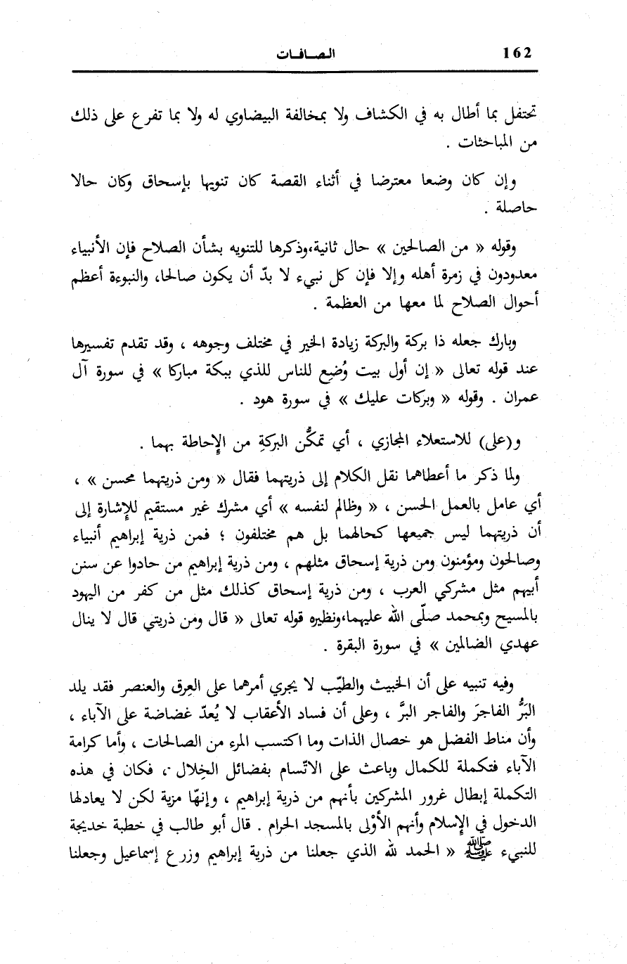 وَلَمَّا ذَكَرَ مَا أَعْطَاهُمَا نَقَلَ الْكَلَامَ إِلَى ذُرِّيَّتِهِمَا فَقَالَ: وَمِنْ ذُرِّيَّتِهِما مُحْسِنٌ، أَيْ عَامِلٌ بِالْعَمَلِ الْحَسَنِ، وَظالِمٌ لِنَفْسِهِ أَيْ مُشْرِكٌ غَيْرُ مُسْتَقِيمٍ لِلْإِشَارَةِ إِلَى أَنَّ ذَرِّيَّتَهُمَا لَيْسَ جَمِيعُهَا كَحَالِهِمَا بَلْ هُمْ مُخْتَلِفُونَ فَمِنْ ذُرِّيَّةِ إِبْرَاهِيمَ أَنْبِيَاءٌ وَصَالِحُونَ وَمُؤْمِنُونَ وَمِنْ ذُرِّيَّةِ إِسْحَاقَ مِثْلُهُمْ، وَمِنْ ذُرِّيَّةِ إِبْرَاهِيمَ مَنْ حَادُوا عَنْ سُنَنِ أَبِيهِمْ مِثْلَ مُشْرِكِي الْعَرَبِ، وَمِنْ ذُرِّيَّةِ إِسْحَاقَ كَذَلِكَ مِثْلَ مَنْ كَفَرَ مِنَ الْيَهُودِ بِالْمَسِيحِ وَبِمُحَمَّدٍ صَلَّى اللَّهُ عَلَيْهِمَا، وَنَظِيرُهُ قَوْلُهُ تَعَالَى: قالَ وَمِنْ ذُرِّيَّتِي قالَ لَا يَنالُ عَهْدِي الظَّالِمِينَ فِي سُورَةِ الْبَقَرَةِ [124] .