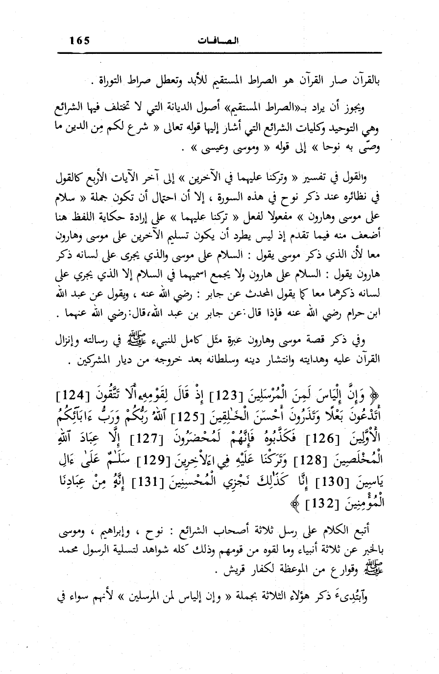 وَالْقَوْلُ فِي تَفْسِيرِ وَتَرَكْنا عَلَيْهِما فِي الْآخِرِينَ إِلَى آخِرِ الْآيَاتِ الْأَرْبَعِ كَالْقَوْلِ فِي نَظَائِرِهِ عِنْدَ ذِكْرِ نُوحٍ فِي هَذِهِ السُّورَةِ، إِلَّا أَنَّ احْتِمَالَ أَنْ تَكُونَ جُمْلَةُ سَلامٌ عَلى مُوسى وَهارُونَ مَفْعُولًا لِفِعْلِ تَرَكْنا عَلَيْهِما عَلَى إِرَادَةِ حِكَايَةِ اللَّفْظِ هُنَا أَضْعَفُ مِنْهُ فِيمَا تَقَدَّمَ إِذْ لَيْسَ يَطَّرِدُ أَنْ يَكُونَ تَسْلِيمُ الْآخَرِينَ عَلَى مُوسَى وَهَارُونَ مَعًا لِأَنَّ الَّذِي ذَكَرَ مُوسَى يَقُولُ: السَّلَامُ عَلَى مُوسَى وَالَّذِي يَجْرِي عَلَى لِسَانِهِ ذِكْرُ هَارُونَ يَقُولُ: السَّلَامُ عَلَى هَارُونَ وَلَا يَجْمَعُ اسْمَيْهِمَا فِي السَّلَامِ إِلَّا الَّذِي يَجْرِي عَلَى لِسَانِهِ ذِكْرُهُمَا مَعًا كَمَا يَقُولُ الْمُحَدِّثُ عَنْ جَابِرٍ: رَضِيَ اللَّهُ عَنْهُ، وَيَقُولُ عَنْ عَبْدِ اللَّهِ بْنِ حَرَامٍ رَضِيَ اللَّهُ عَنْهُ فَإِذَا قَالَ: عَنْ جَابِرِ بْنِ عَبْدِ اللَّهِ، قَالَ: رَضِيَ اللَّهُ عَنْهُمَا.