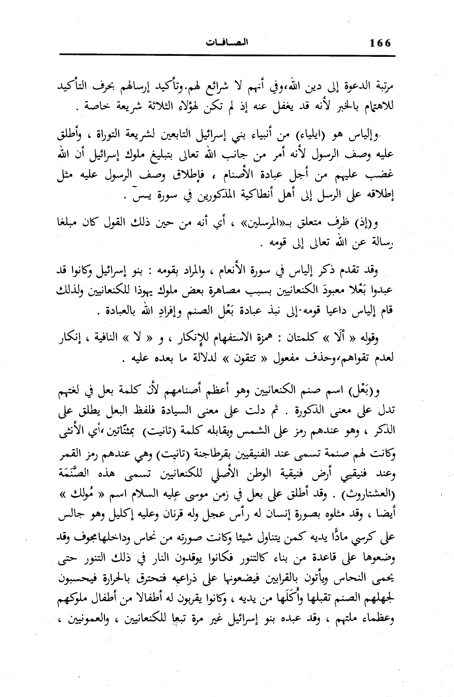 وَ (بَعْلٌ) اسْمُ صَنَمِ الْكَنْعَانِيِّينَ وَهُوَ أَعْظَمُ أَصْنَامِهِمْ لِأَنَّ كَلِمَةَ بَعْلٍ فِي لُغَتِهِمْ تَدُلُّ عَلَى مَعْنَى الذُّكُورَةِ. ثُمَّ دَلَّتْ عَلَى مَعْنَى السِّيَادَةِ فَلَفْظُ الْبَعْلِ يُطْلَقُ عَلَى الذَّكَرِ، وَهُوَ عِنْدَهُمْ رَمْزٌ عَلَى الشَّمْسِ وَيُقَابِلُهُ كَلِمَةُ (تَانِيتْ) بِمُثَنَّاتَيْنِ، أَيِ الْأُنْثَى وَكَانَت لَهُم صنمة تُسَمَّى عِنْدَ الْفِينِيقِيِّينَ بِقُرْطَاجَنَّةَ (تَانِيتْ) وَهِيَ عِنْدَهُمْ رَمْزُ الْقَمَرِ وَعِنْدَ فِينِيقِيِّيِ أَرْضِ فِينِيقِيَّةَ الْوَطَنُ الْأَصْلِيُّ لِلْكَنْعَانِيِّينَ تُسَمَّى هَذِهِ الصَّنَمَةُ (الْعَشْتَارُوثْ) . وَقَدْ أُطْلِقَ عَلَى بَعْلٍ فِي زَمَنِ مُوسَى عَلَيْهِ السَّلَامُ اسْمُ «مُولَكْ» أَيْضًا، وَقَدْ مَثَّلُوهُ بِصُورَةِ إِنْسَانٍ لَهُ رَأْسُ عِجْلٍ وَلَهُ قَرْنَانِ وَعَلَيْهِ إِكْلِيلٌ وَهُوَ جَالِسٌ عَلَى كُرْسِيٍّ مَادًّا يَدَيْهِ كَمَنْ يَتَنَاوَلُ شَيْئًا وَكَانَتْ صُورَتُهُ مِنْ نُحَاسٍ وَدَاخِلُهَا مُجَوَّفٌ وَقَدْ وَضَعُوهَا عَلَى قَاعِدَةٍ مِنْ بِنَاءٍ كَالتَّنُّورِ فَكَانُوا يُوقِدُونَ النَّارَ فِي ذَلِكَ التَّنُّورِ حَتَّى يُحْمَى النُّحَاسُ وَيَأْتُونَ بِالْقَرَابِينِ فَيَضَعُونَهَا عَلَى ذِرَاعَيْهِ فَتَحْتَرِقُ بِالْحَرَارَةِ فَيَحْسَبُونَ لِجَهْلِهِمُ الصَّنَمَ تَقَبَّلَهَا وَأَكَلَهَا مِنْ يَدَيْهِ، وَكَانُوا يُقَرِّبُونَ لَهُ أَطْفَالًا مِنْ أَطْفَالِ مُلُوكِهِمْ وَعُظَمَاءِ مِلَّتِهِمْ، وَقَدْ عَبَدَهُ بَنُو إِسْرَائِيلَ غَيْرَ مَرَّةٍ تَبَعًا لِلْكَنْعَانِيِّينَ، وَالْعَمُونِيِّينَ،